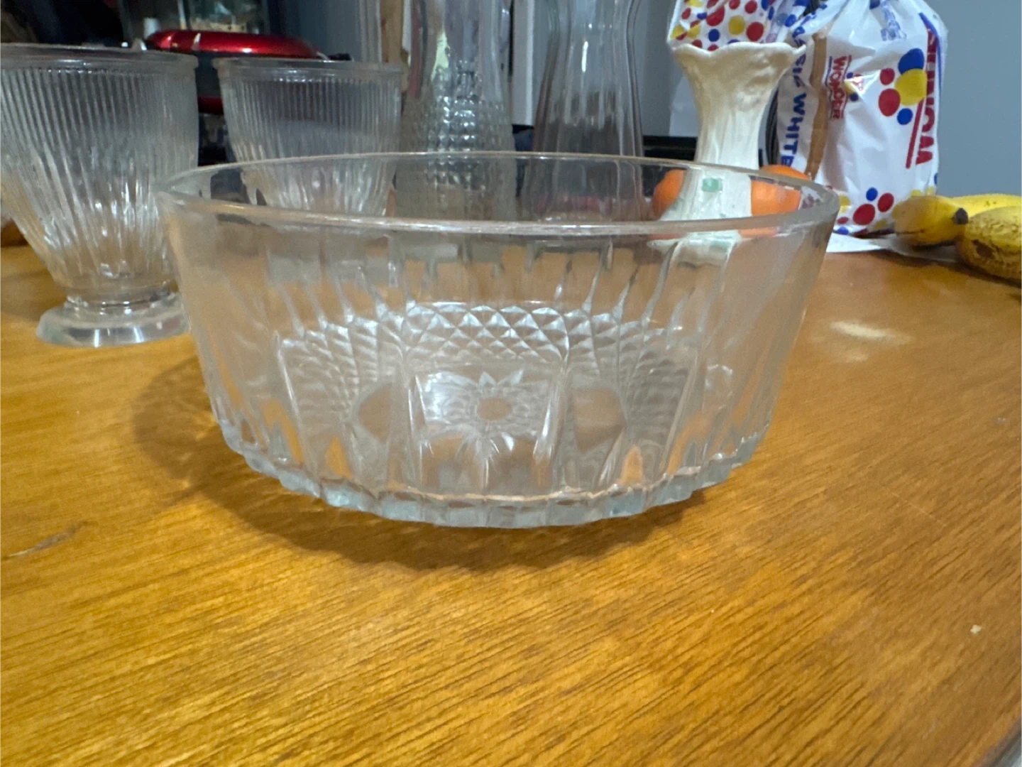 Selling a clear glass serving bowl. It's in great condition and ready for your next gathering or to display your favorite fruits. The bowl features a beautiful starburst pattern on the bottom, adding a touch of elegance to any table setting
