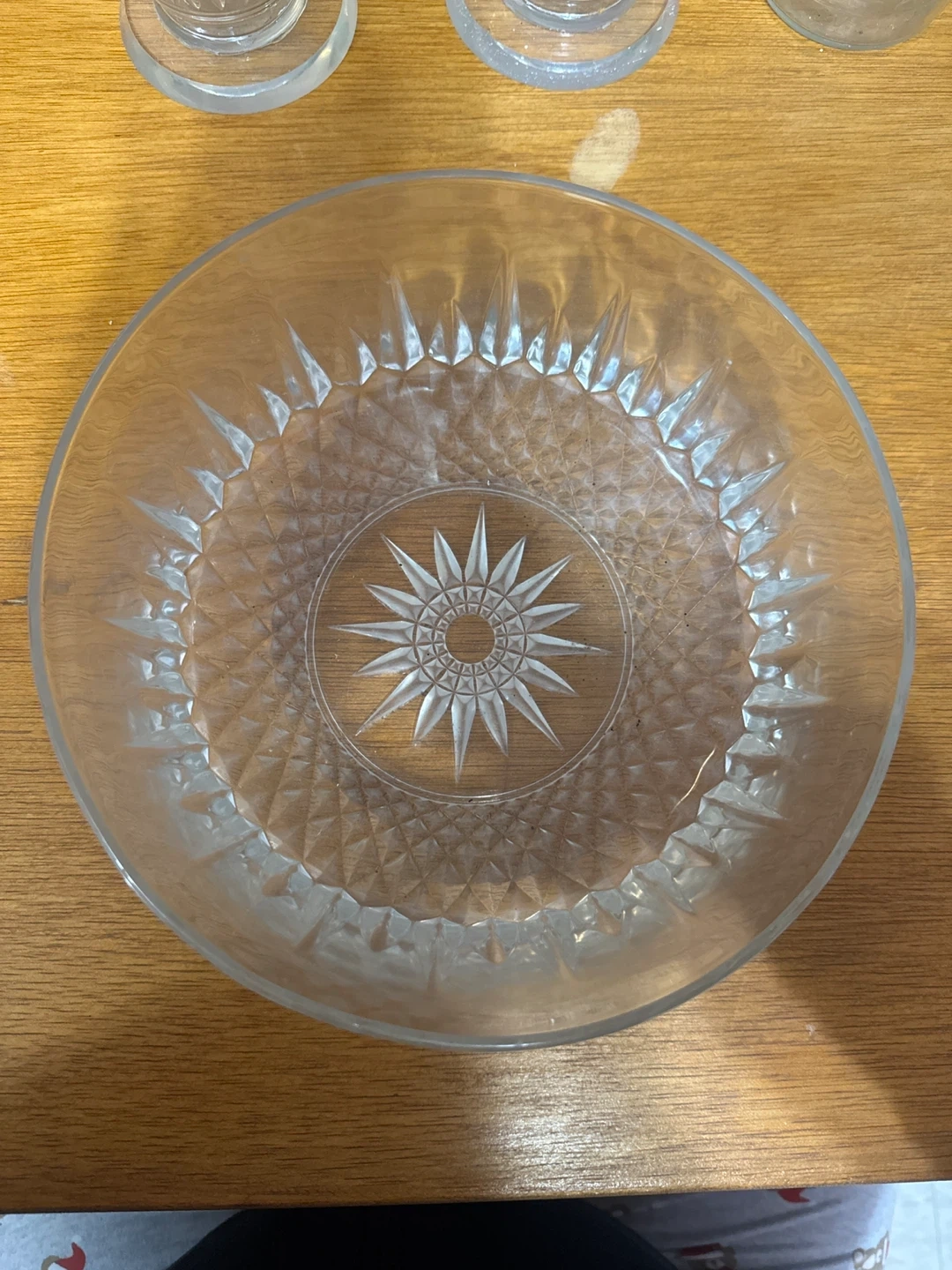 Selling a clear glass serving bowl. It's in great condition and ready for your next gathering or to display your favorite fruits. The bowl features a beautiful starburst pattern on the bottom, adding a touch of elegance to any table setting