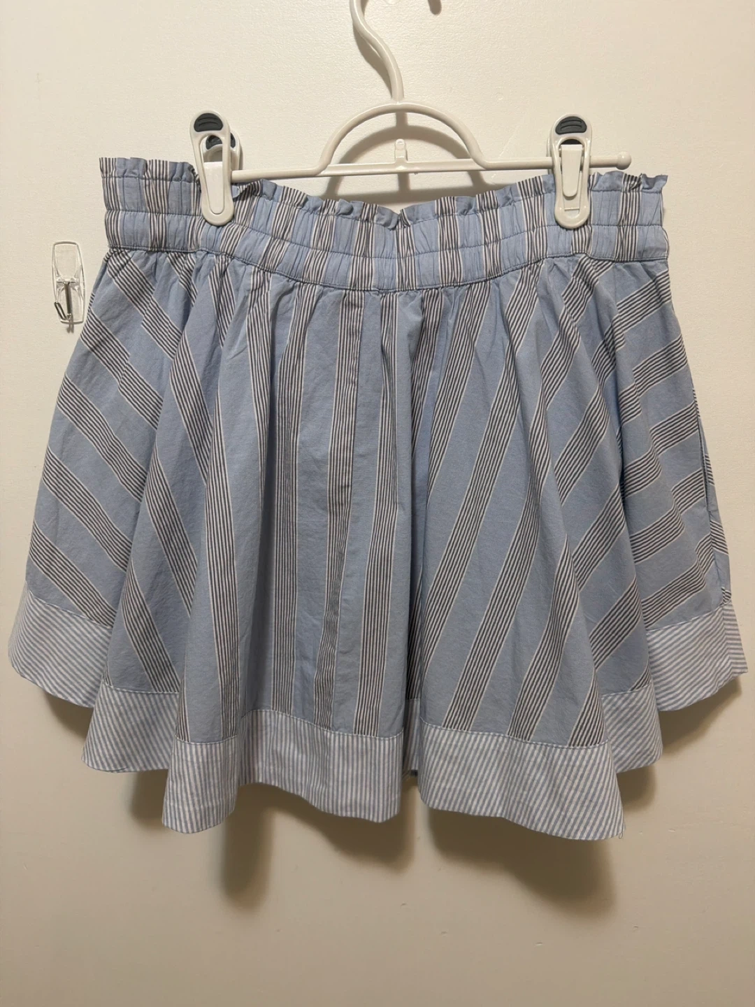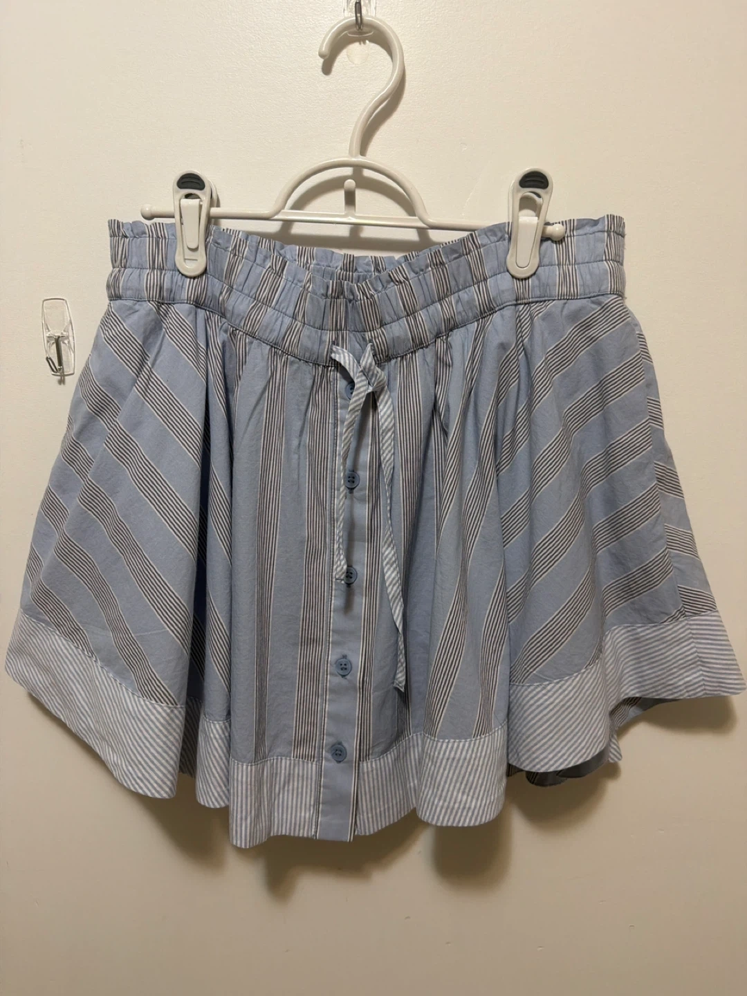 Super Cute Aerie skort in a blue and white striped pattern! It has shorts underneath, making it super comfy and practical. Has a nice flair to it and pockets!!! Size medium.