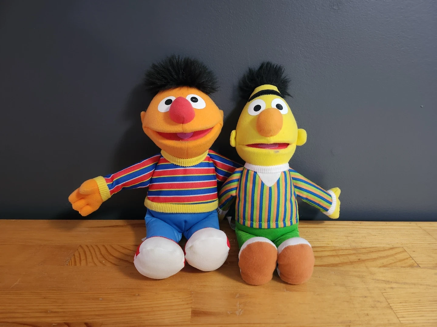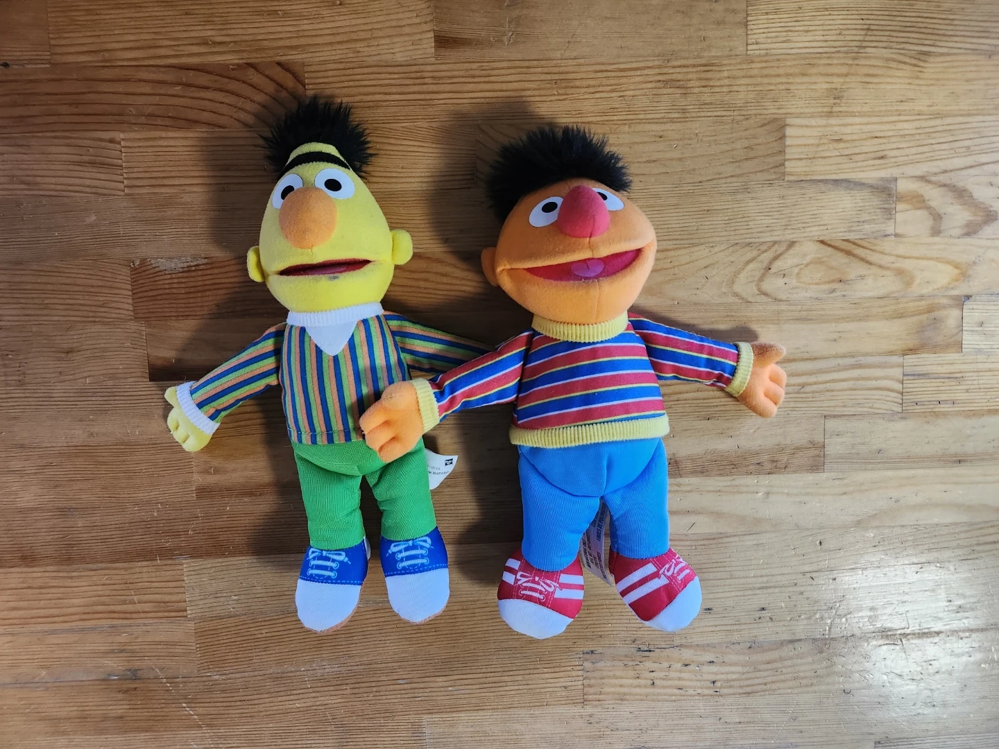Set of Bert and Ernie plush dolls from the television show Sesame Street.