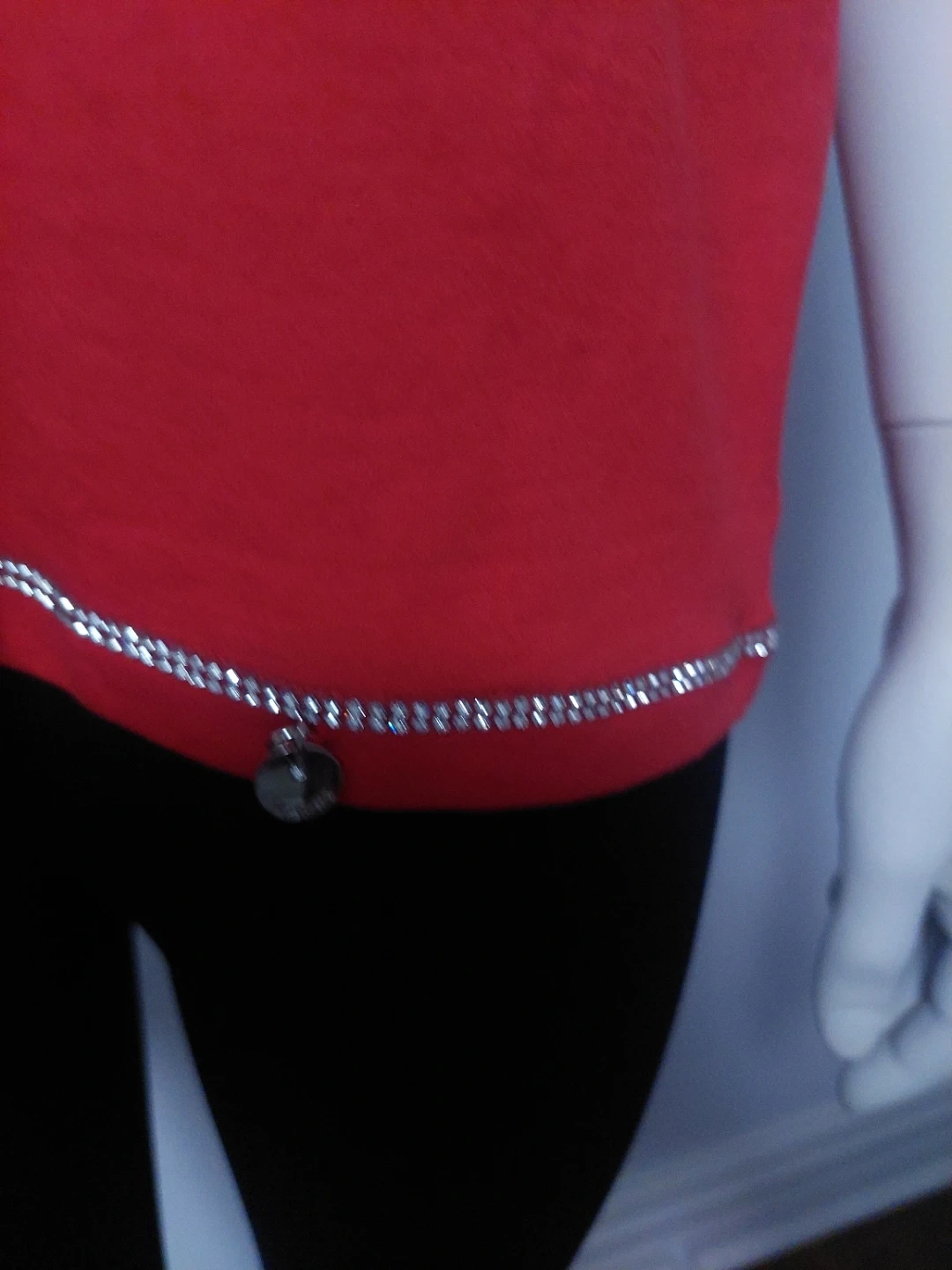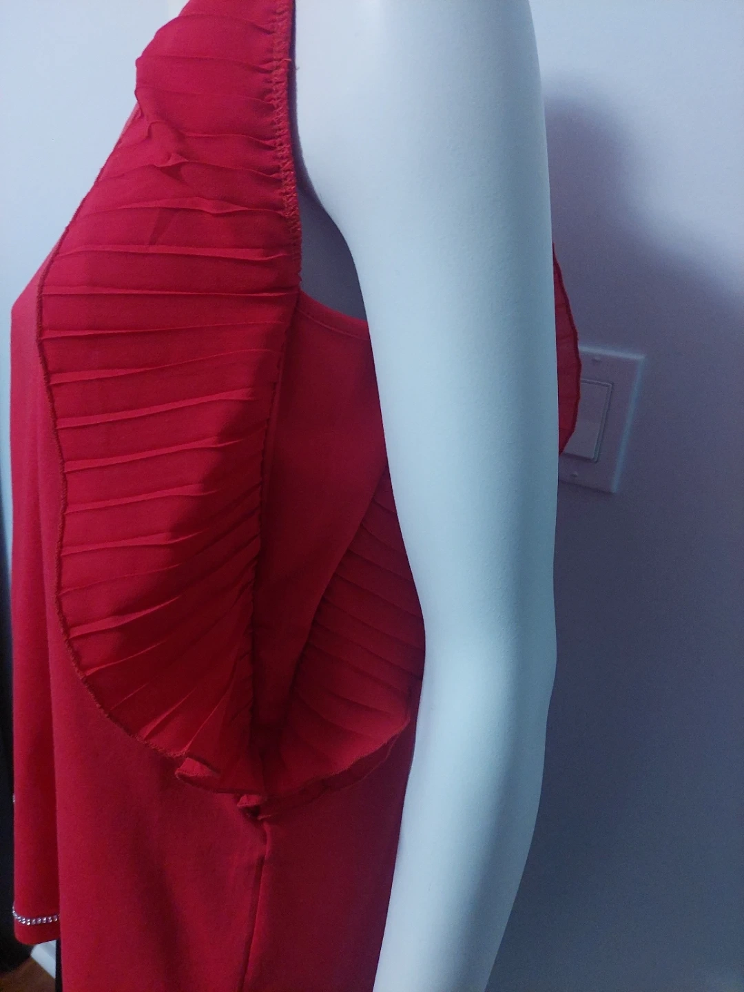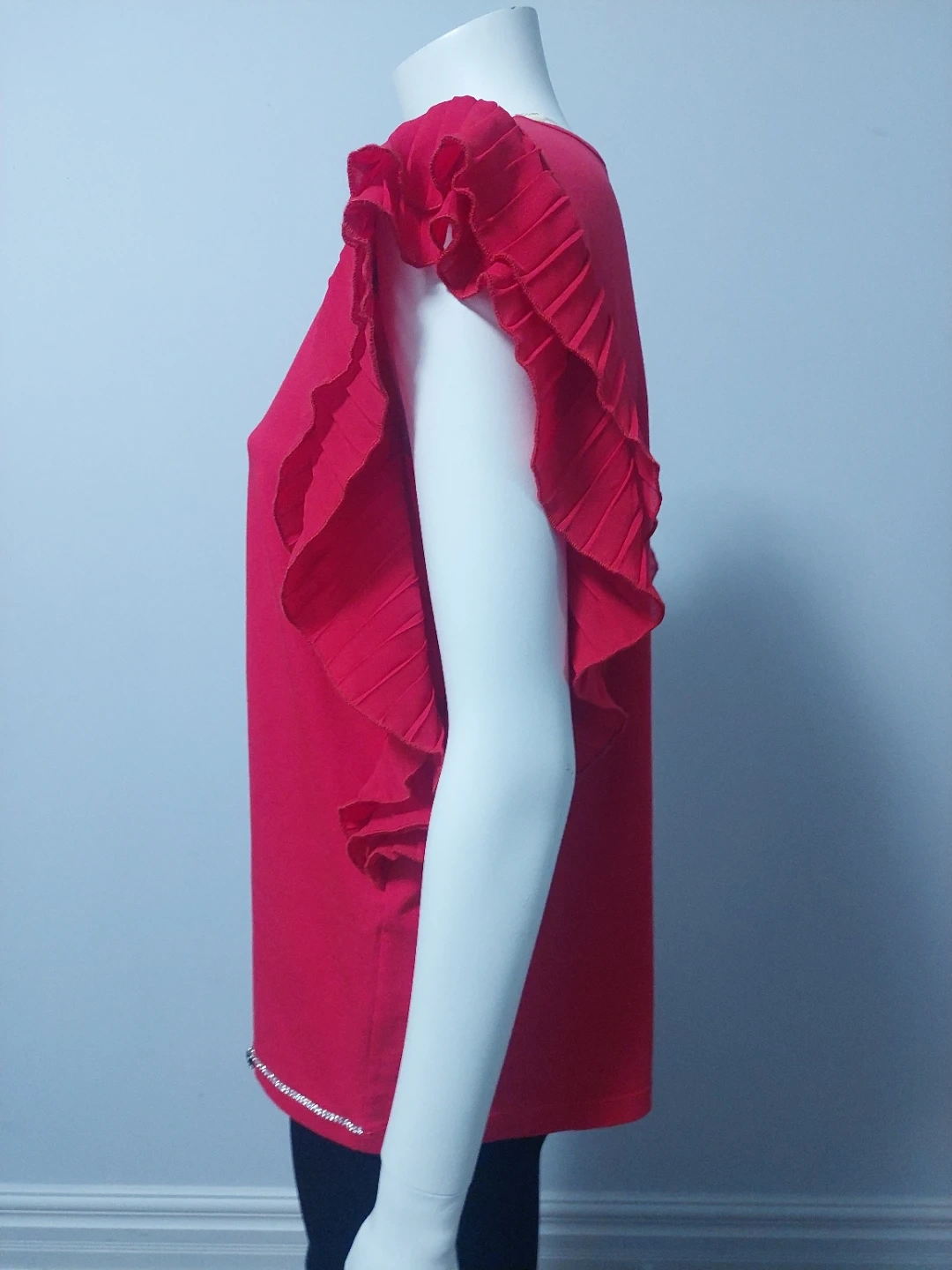 Valentine! Beautiful red top with unique ruffle sleeves. It also has a decorative trim along the bottom. Perfect for adding a pop of colour to your wardrobe!
