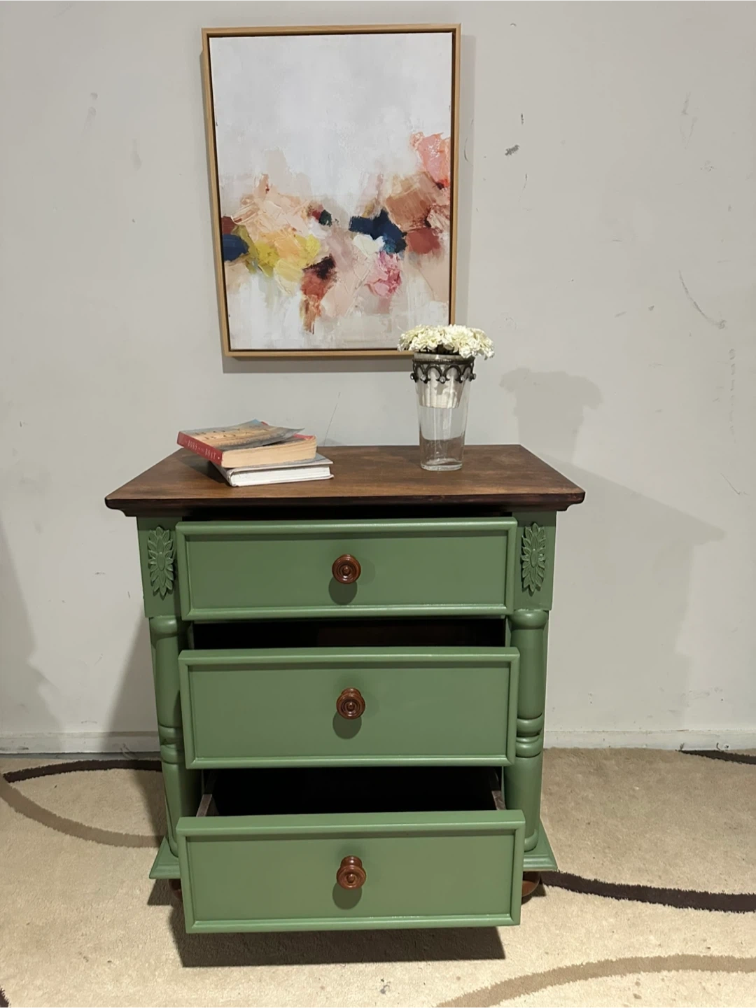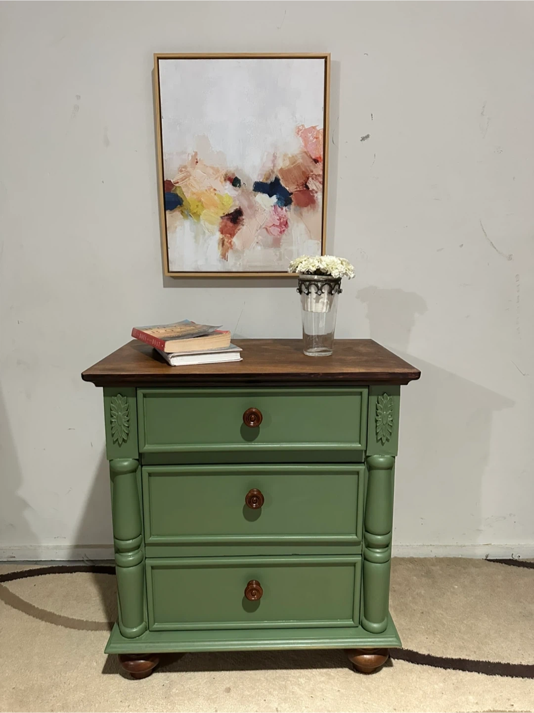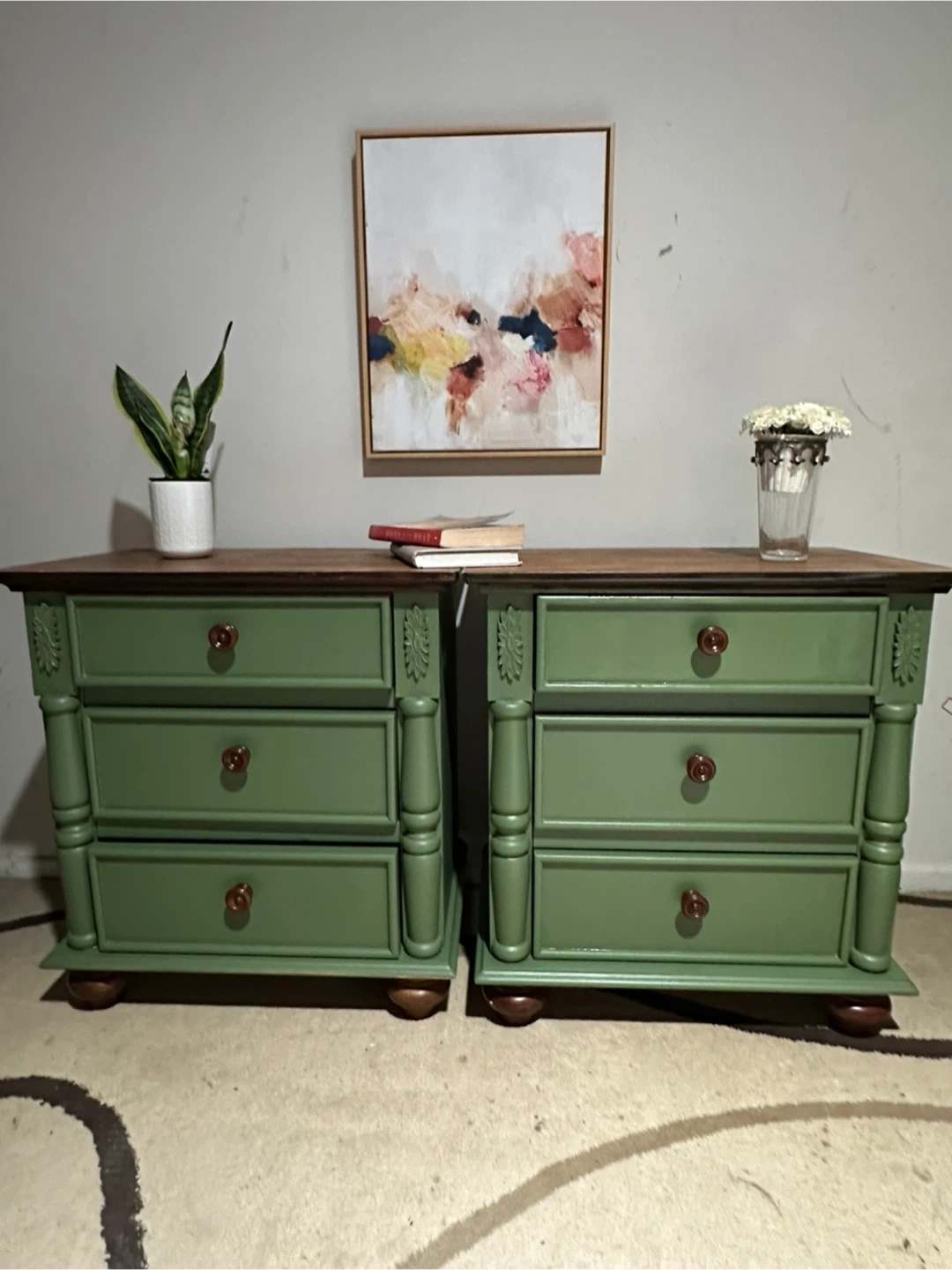 Selling a set of two dressers, painted in a lovely green colour. They would be great for a bedroom or living room. The dressers feature three drawers each, providing ample storage space. They have a rustic, charming look!