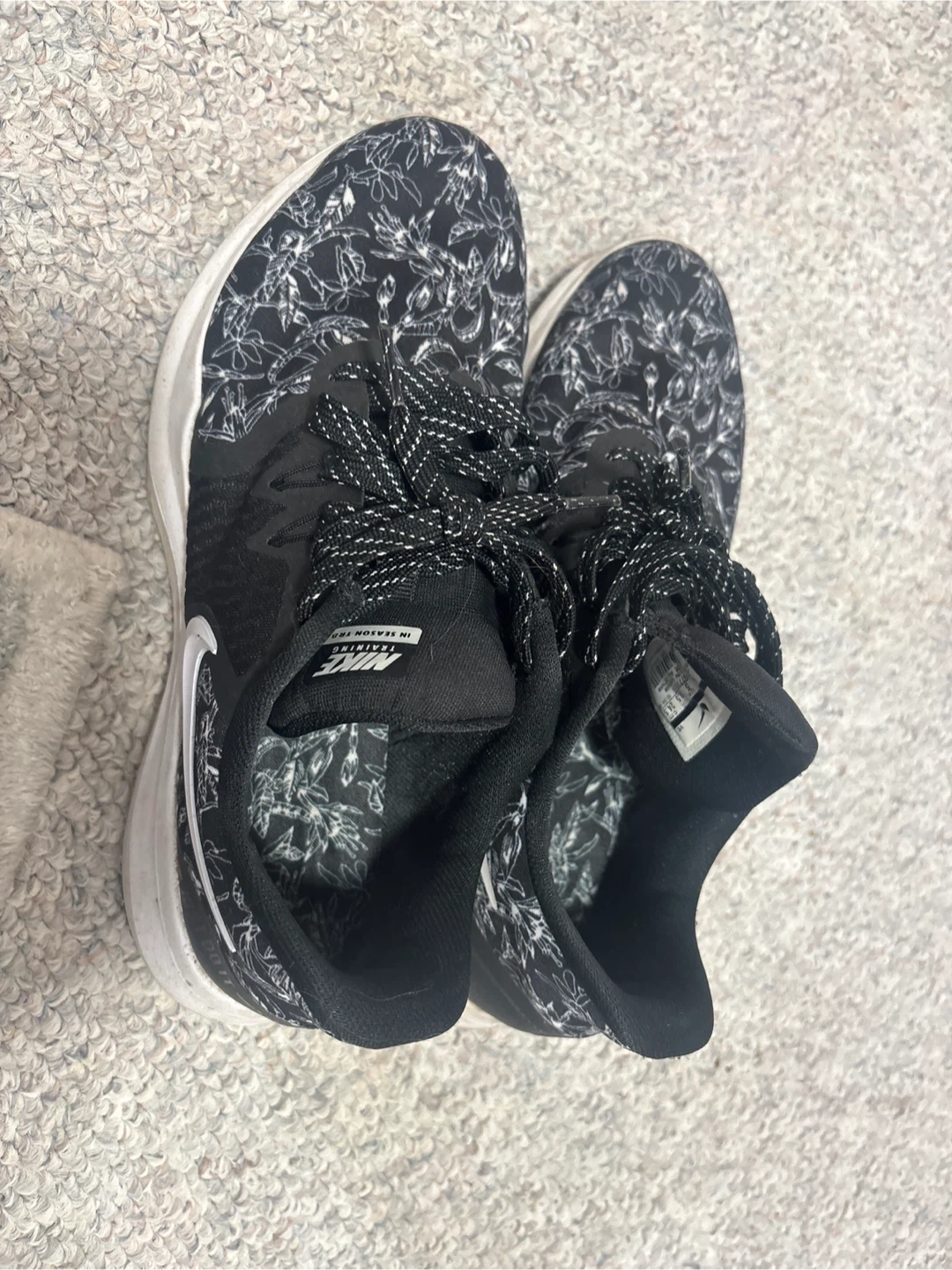 Selling a pair of Nike In Season TR 13 training shoes in a stylish black and white floral pattern! These are great for training and everyday wear. They're in good condition and ready for a new home! Perfect for adding a touch of flair to your workout gear size 7.5 pick up cash only