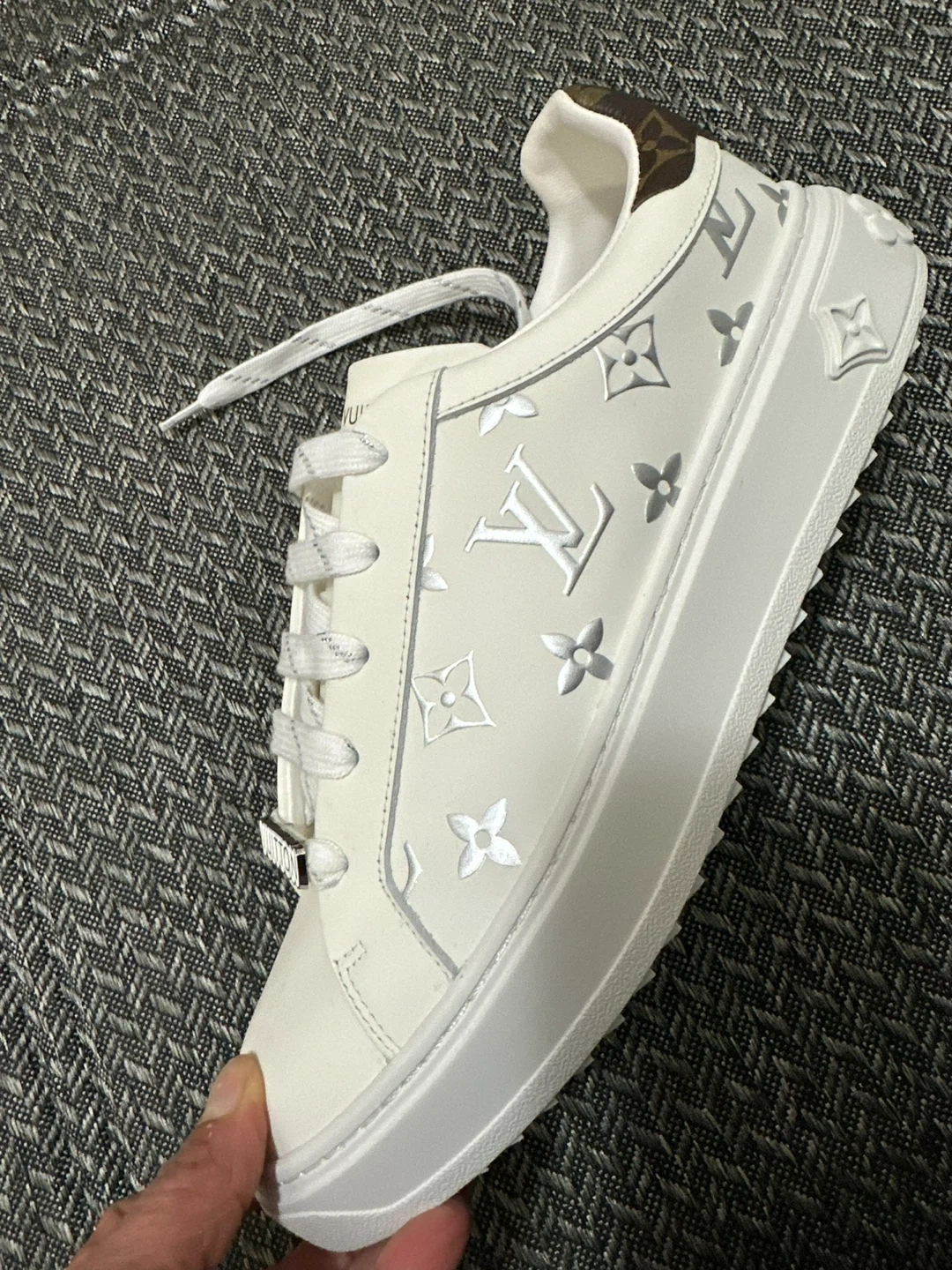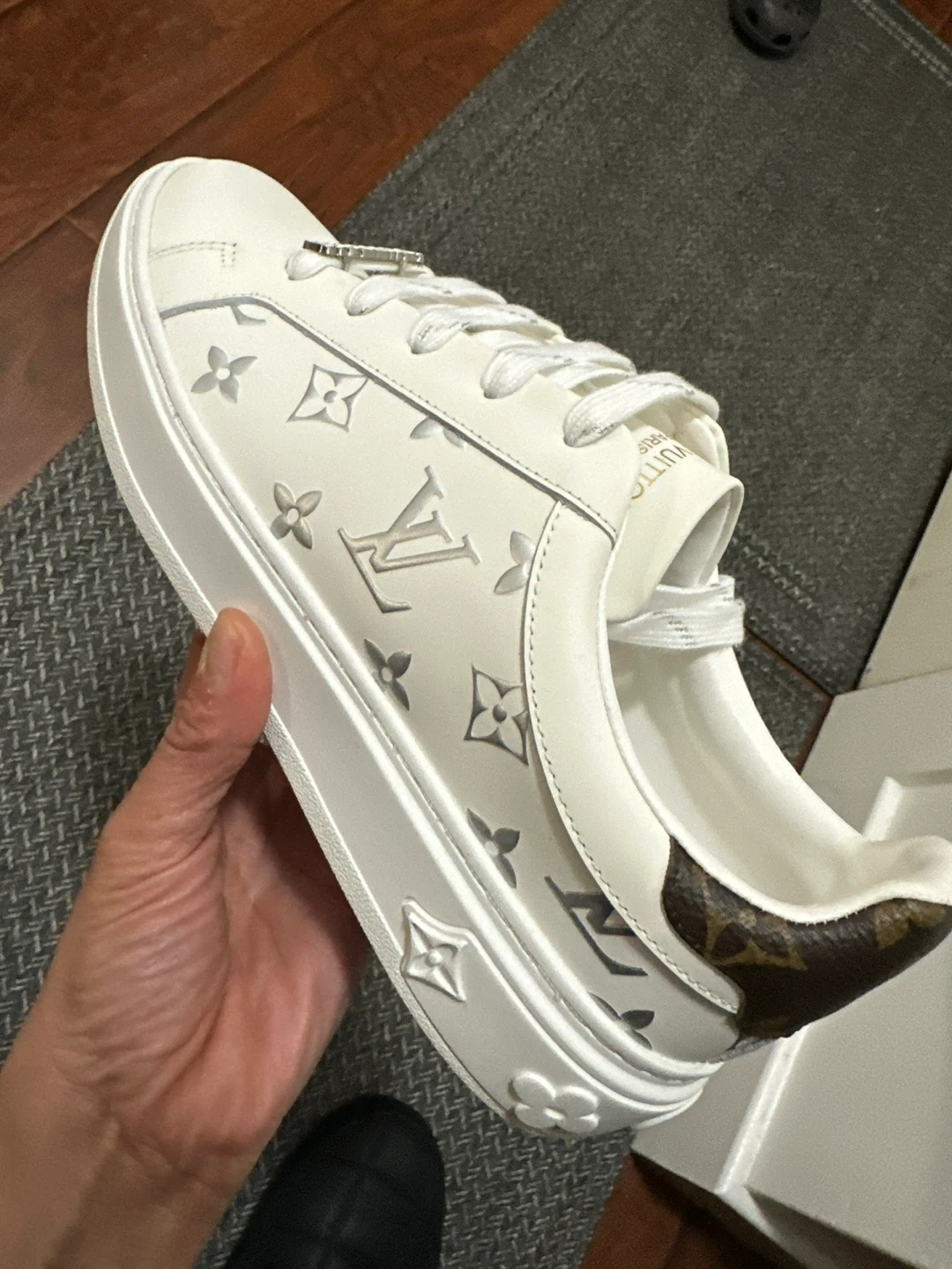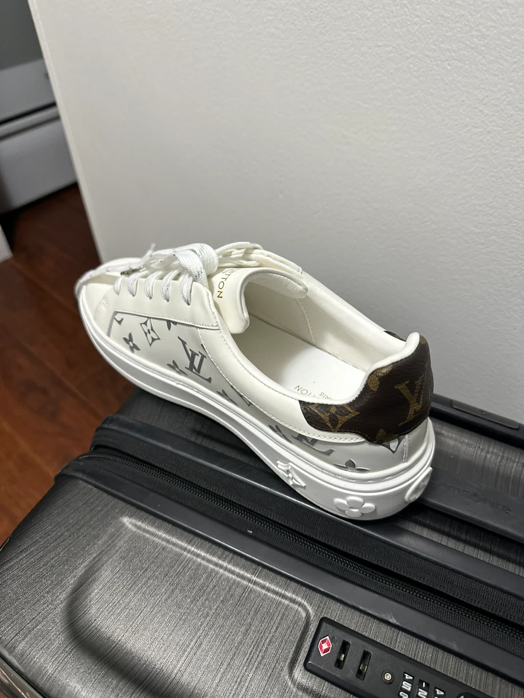 Selling a pair of Louis Vuitton sneakers in white leather. They feature the classic LV monogram pattern in silver throughout. The heel has a brown monogram accent. Great condition!