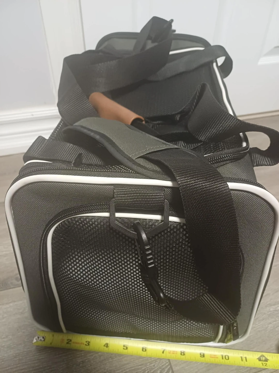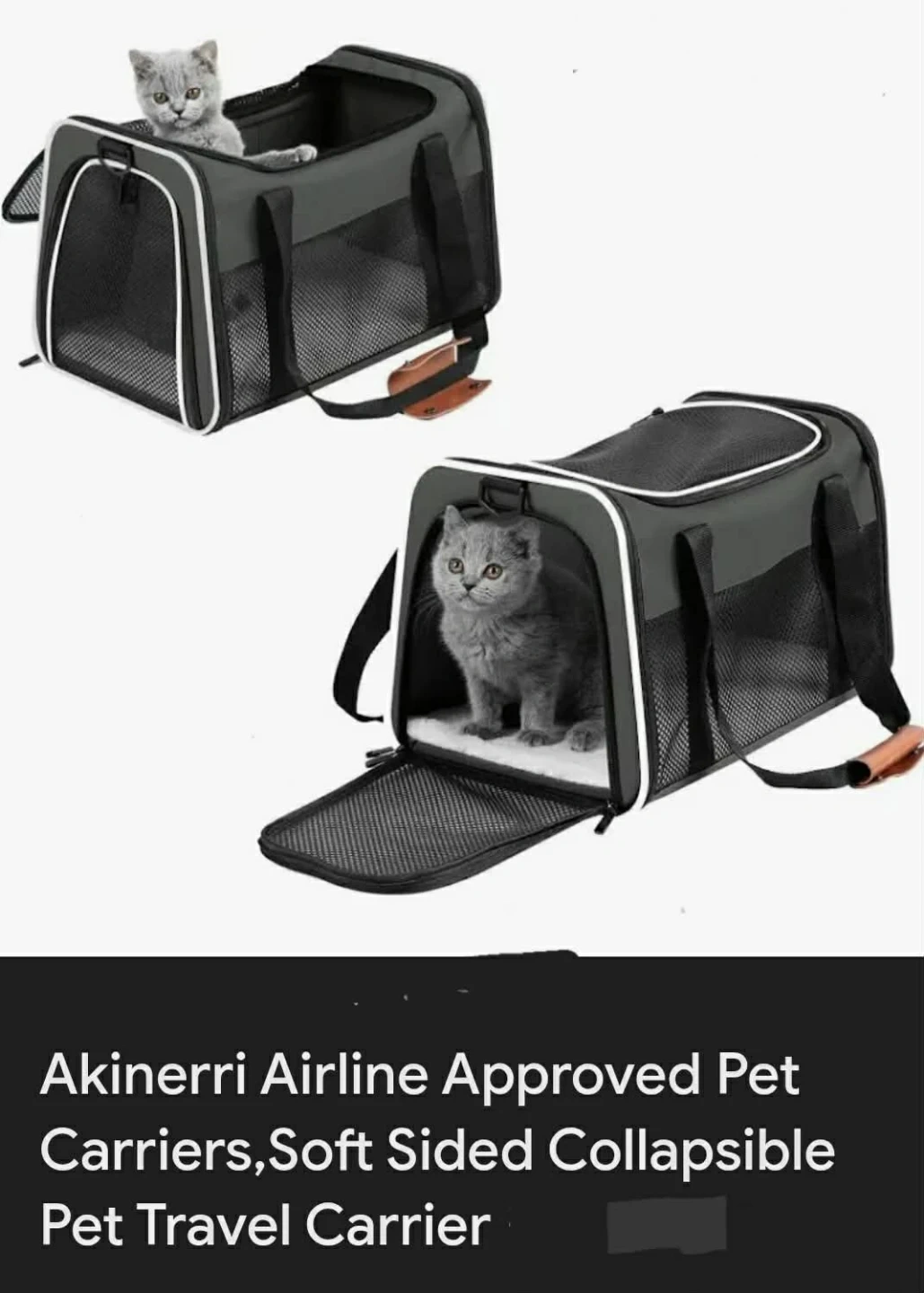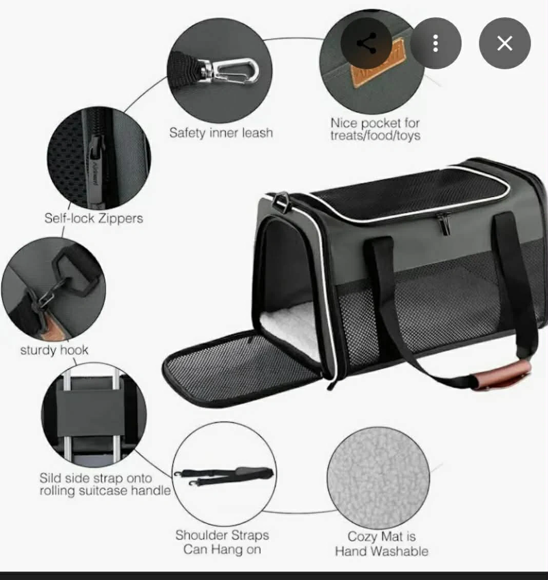 Selling an Akinerri airline approved pet carrier in grey. It's a soft-sided, collapsible pet travel carrier. Measurements are approximately 17 inches long and 11 inches high. Features include a safety inner leash, a pocket for treats/toys, self-lock zippers, a sturdy hook, a side strap onto a rolling suitcase handle, and shoulder straps that can hang on. It also comes with a cozy, hand-washable mat