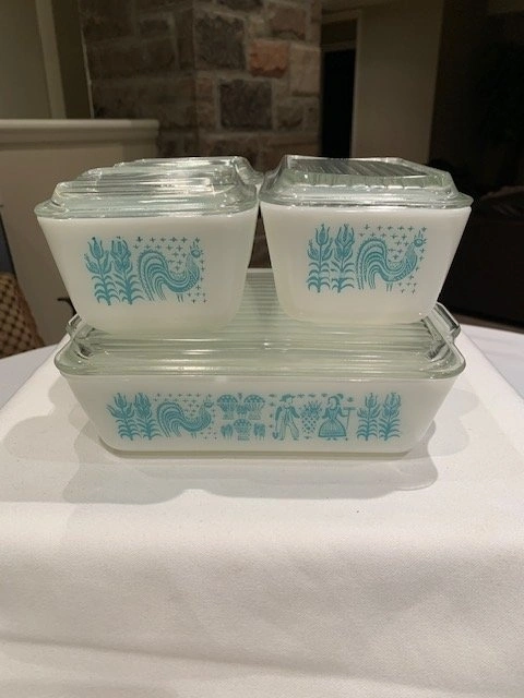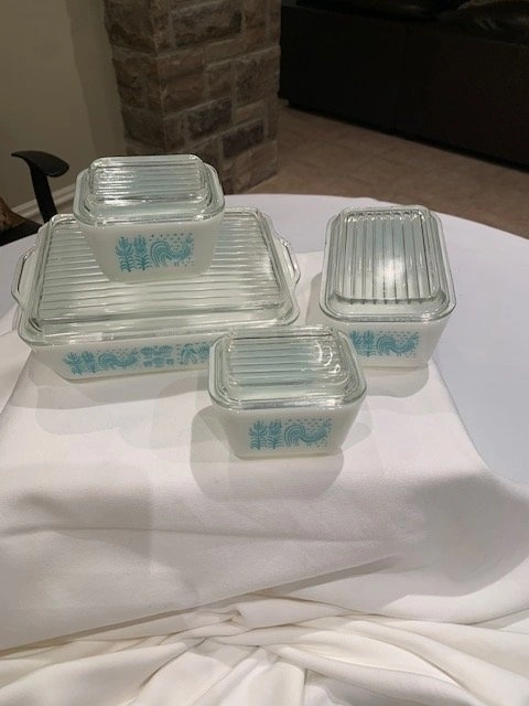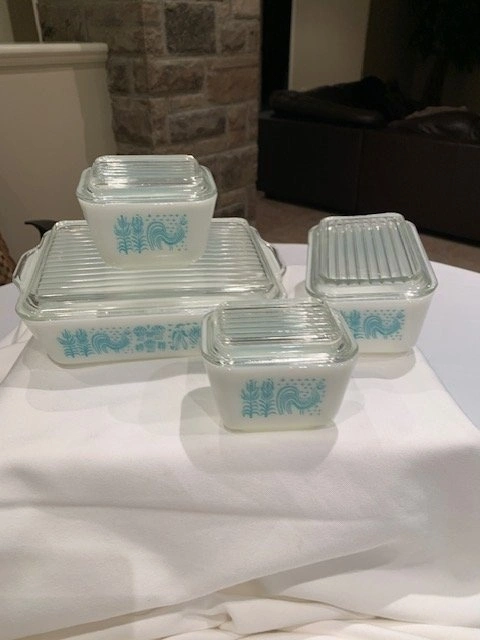 Rare full set of vintage Pyrex Amish Butterprint refrigerator dishes with lids. Mint condition! Includes: 1 Large (4 cups, 8" x 6 1/2"), 1 Medium (2 cups, 6 1/2" x 4"), and 2 Small (1 cup, 4" x 3"). From a smoke-free, pet-free home. Located in Richmond Hill near Bathurst and King Rd.