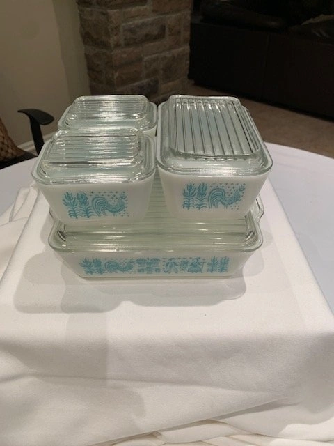 Rare full set of vintage Pyrex Amish Butterprint refrigerator dishes with lids. Mint condition! Includes: 1 Large (4 cups, 8" x 6 1/2"), 1 Medium (2 cups, 6 1/2" x 4"), and 2 Small (1 cup, 4" x 3"). From a smoke-free, pet-free home. Located in Richmond Hill near Bathurst and King Rd.