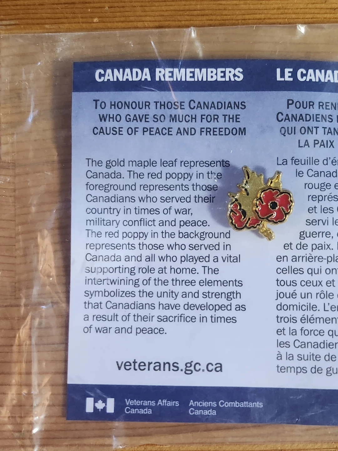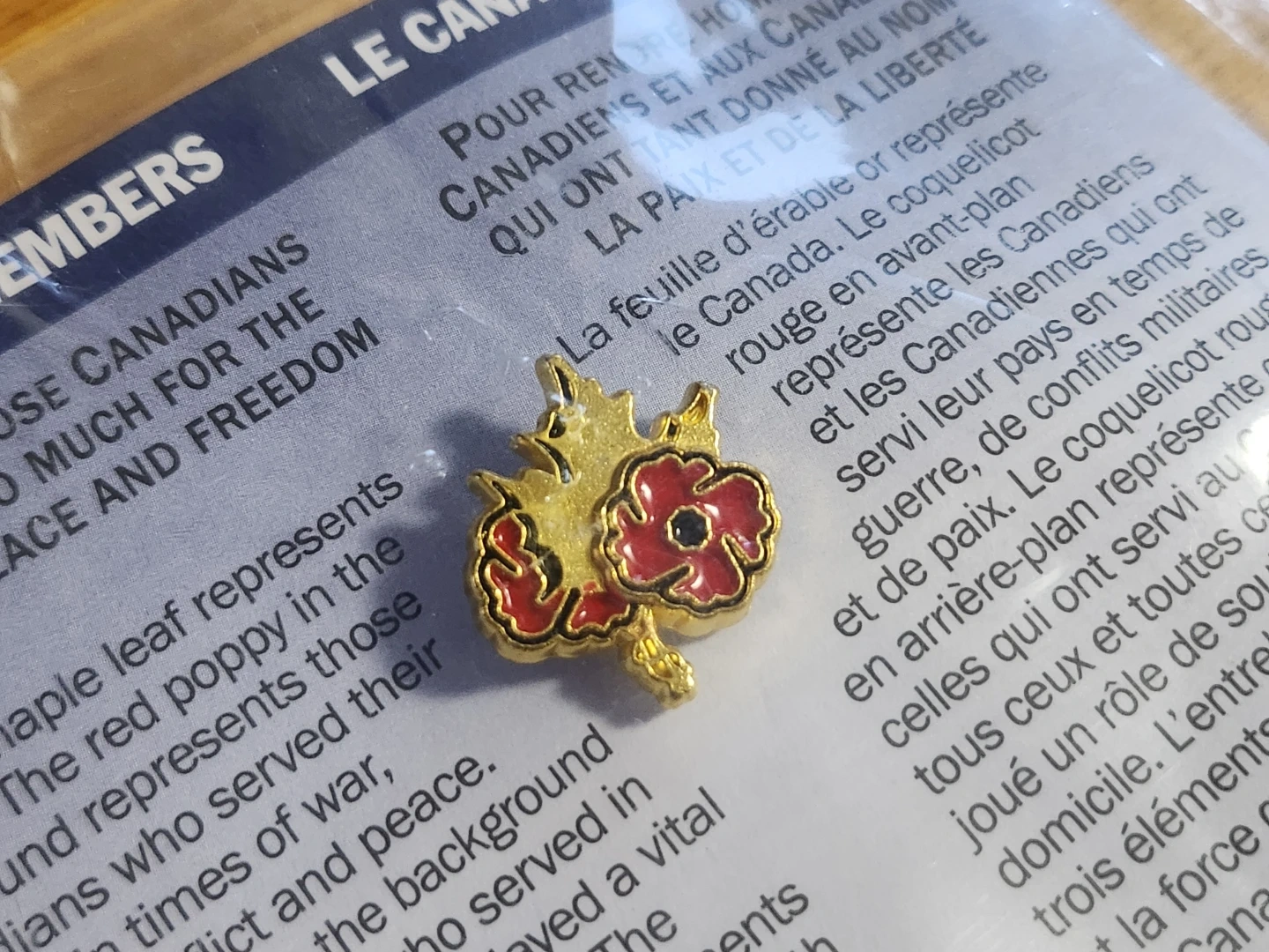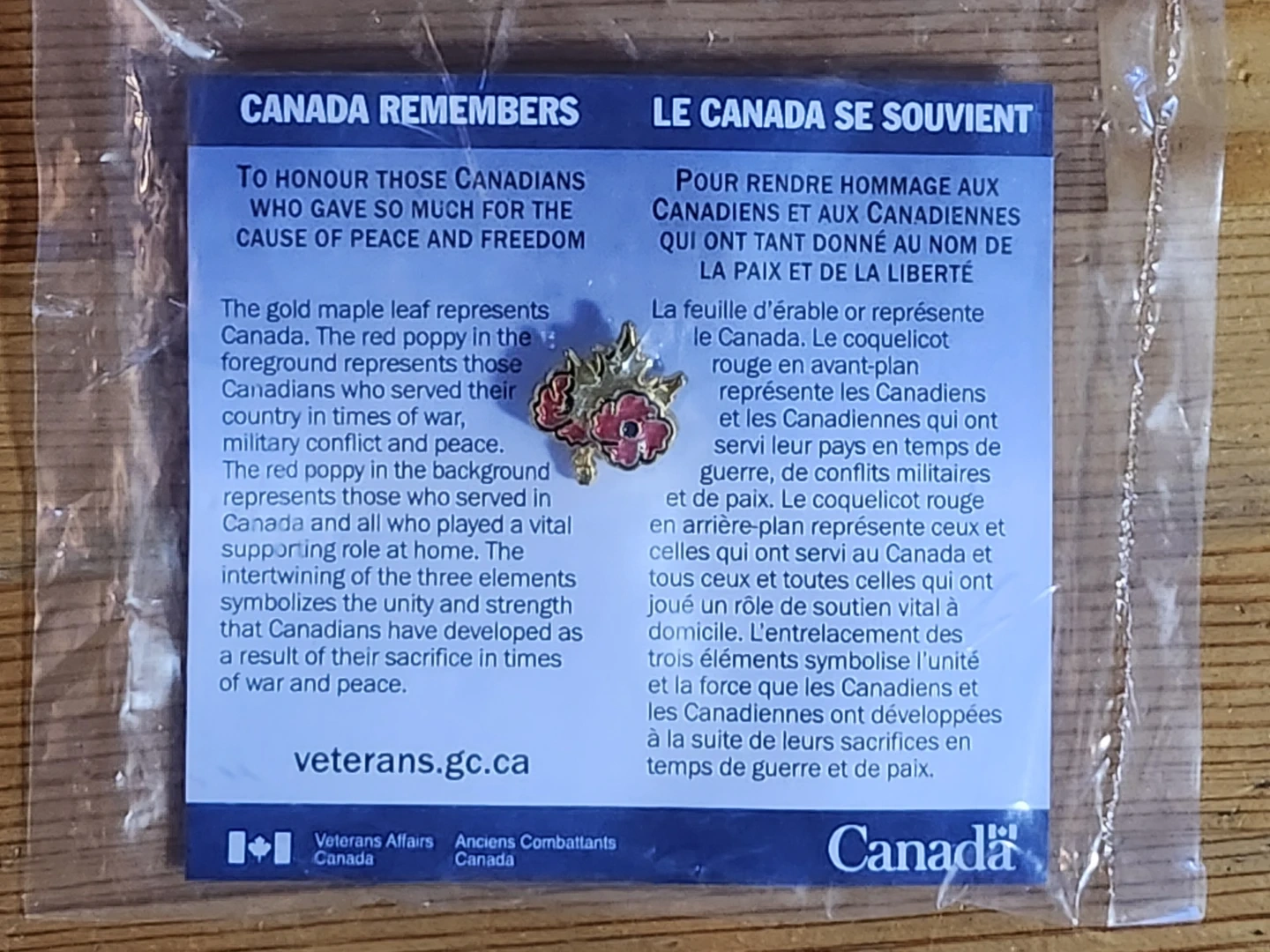 "Canada Remembers" lapel pin distributed by Veterans Affairs Canada. This specific pin features a gold maple leaf and two red poppies, and is an official symbol of remembrance, distinct from the traditional single paper poppy pin.
