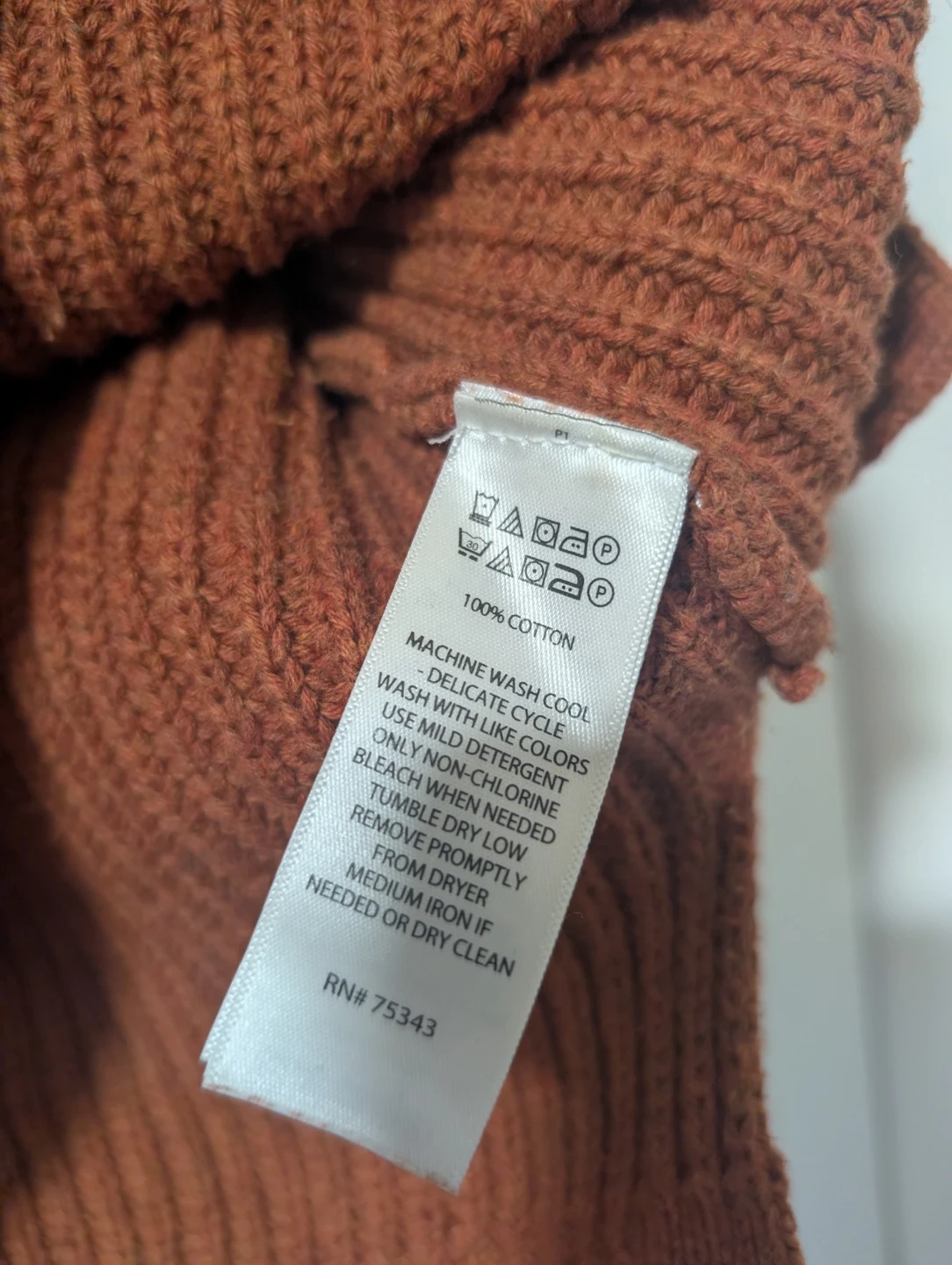 Cozy rust-coloured sweater from Max Studio, perfect for layering! It's an XS and made of 100% cotton, so it's super comfy and easy to care for