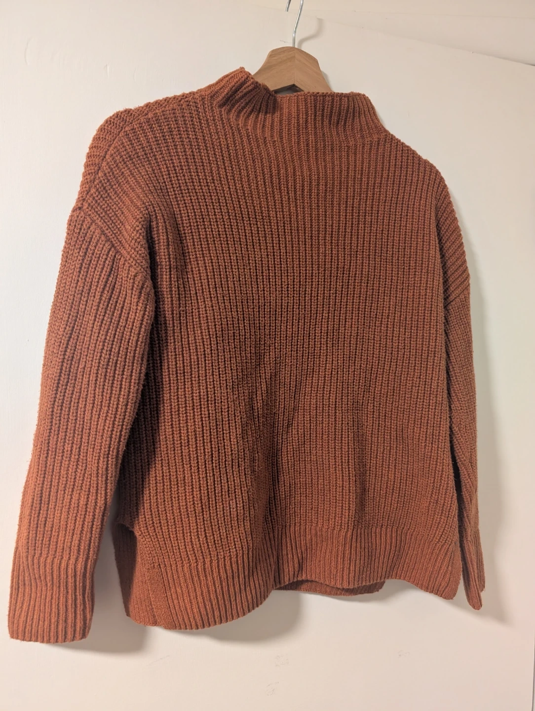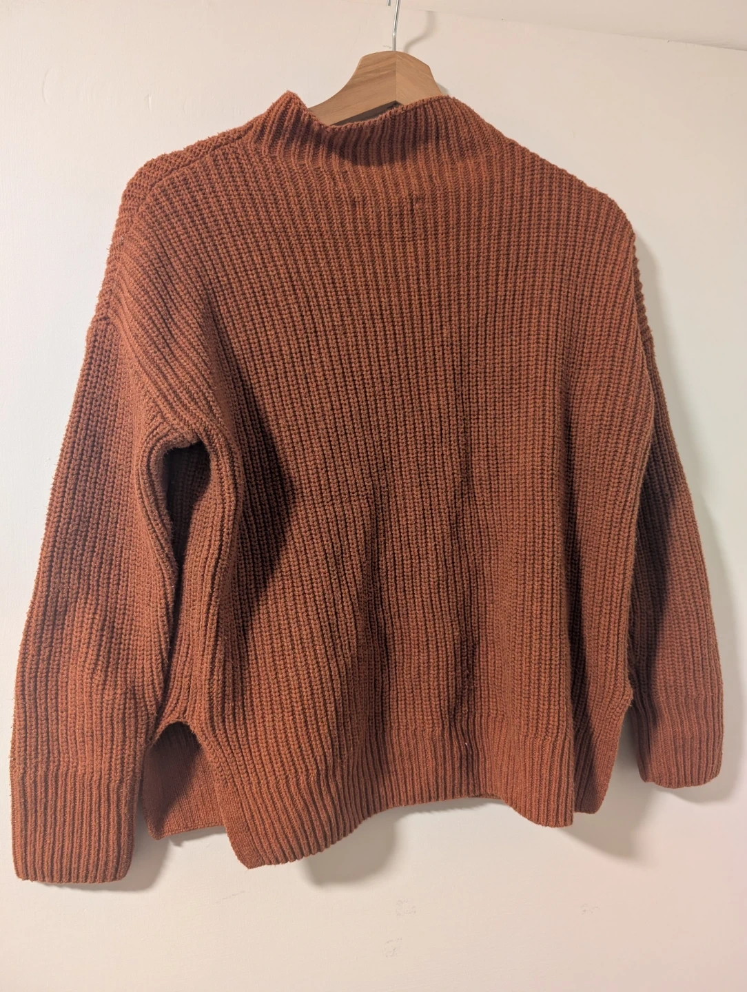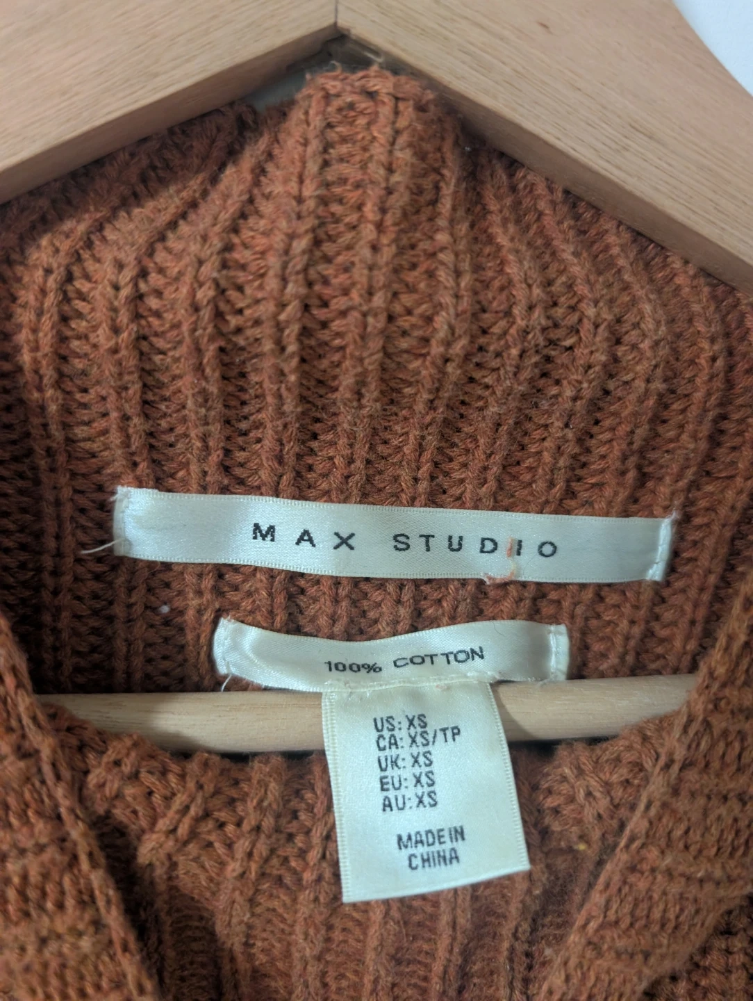 Cozy rust-coloured sweater from Max Studio, perfect for layering! It's an XS and made of 100% cotton, so it's super comfy and easy to care for