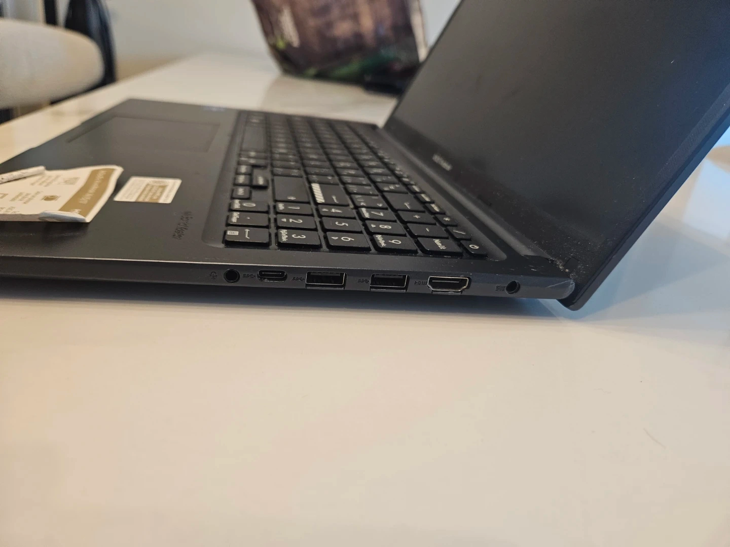 Its an black model Asus vivobook 15 with intel i5 core operating using windows 11. It has USB-C features to connect wired headset or other wired items. Also an hdmi port. The laptop is flexible to bend at a complete 180 degree and is quiet sturdy. The laptop is cleaned and comes with the charger aswell!