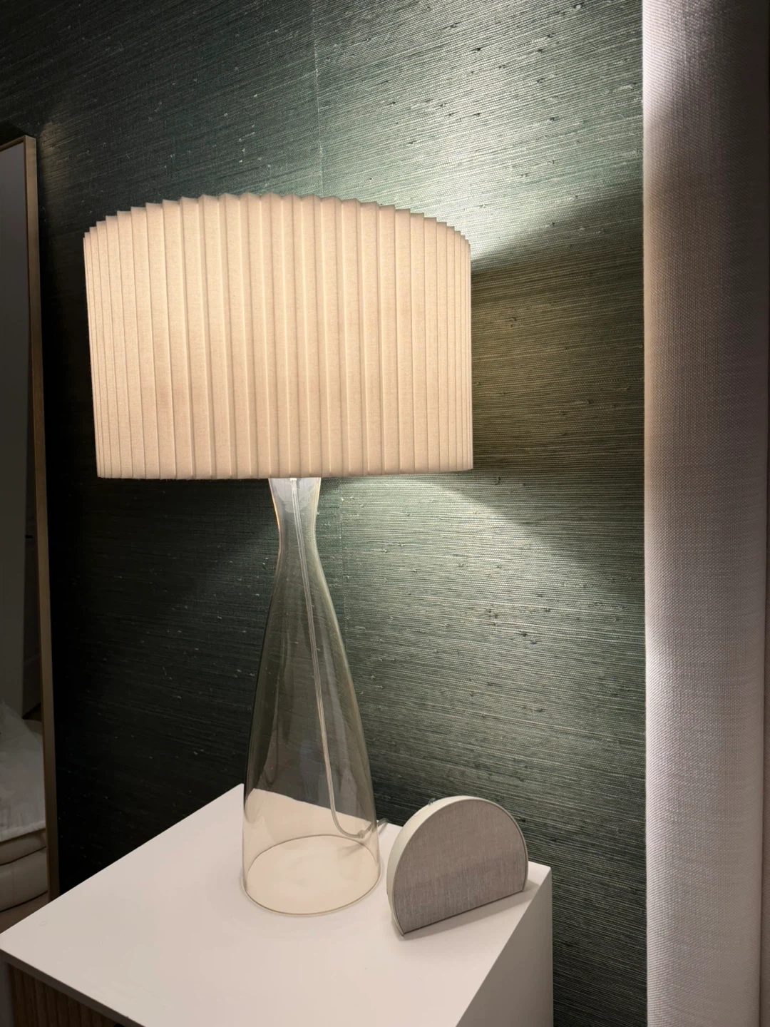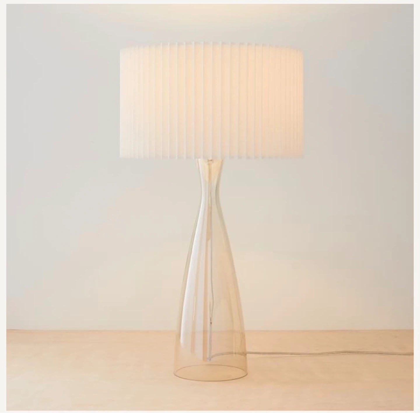 This table lamp features a unique clear glass bottle-shaped base. It's topped with a pleated, neutral-toned lampshade. The lamp provides a warm, diffused light. It's perfect for adding ambient lighting to a living room or bedroom.