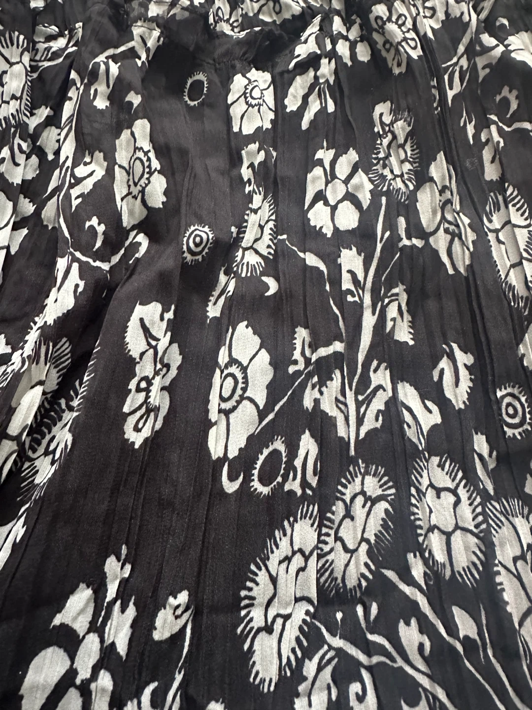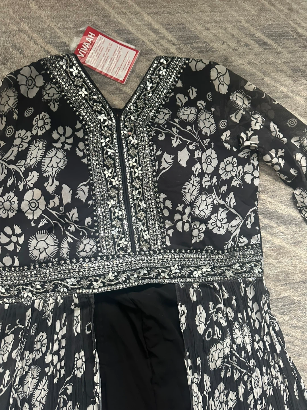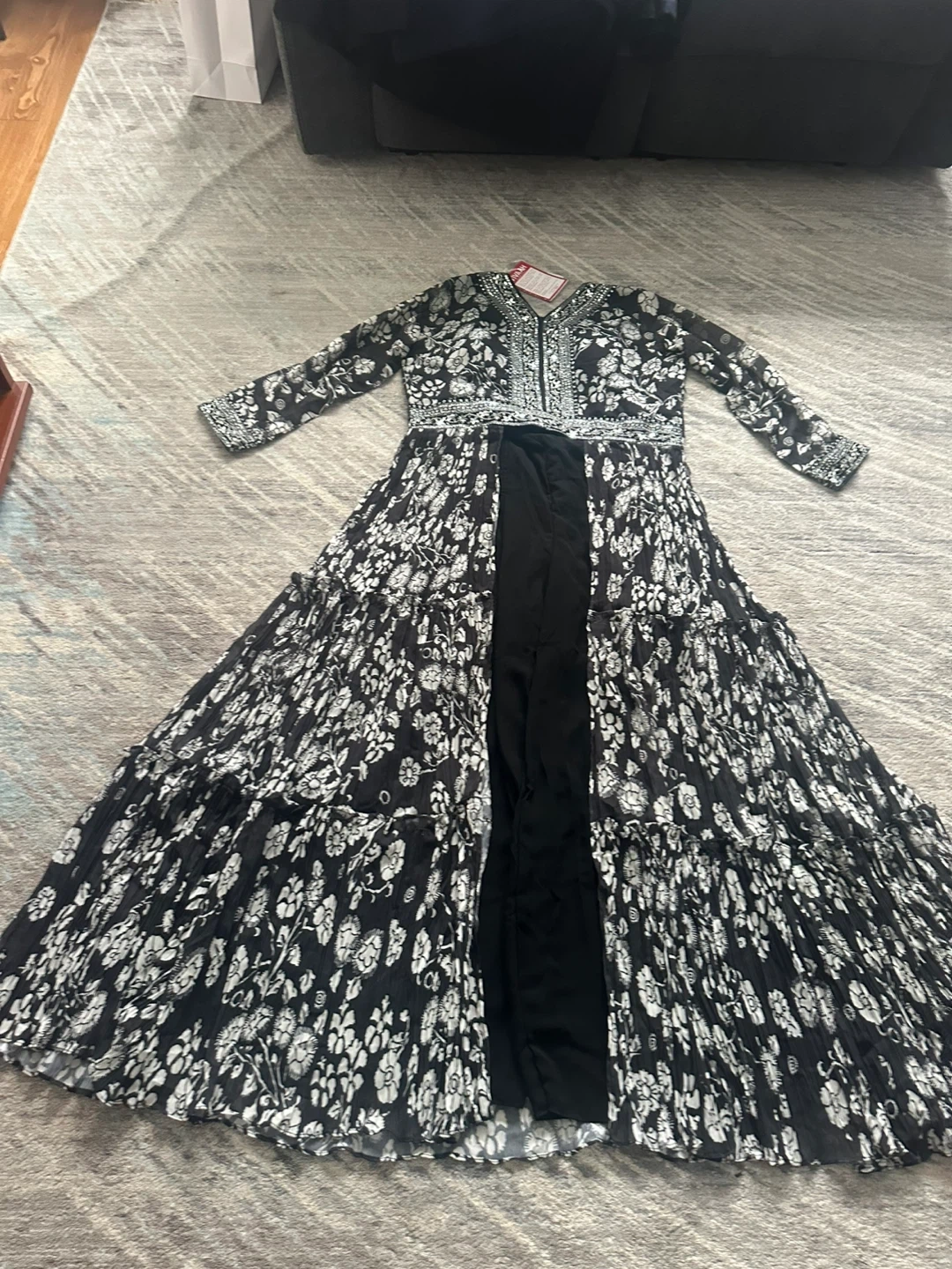 This VIVA-AH maxi dress features a black and white floral print. It has a V-neckline with intricate shisha and sequin embellishments. The dress has long sleeves and a flowing, tiered with plazo pants. This is a beautiful piece for special occasions! Never worn brand new with tag.