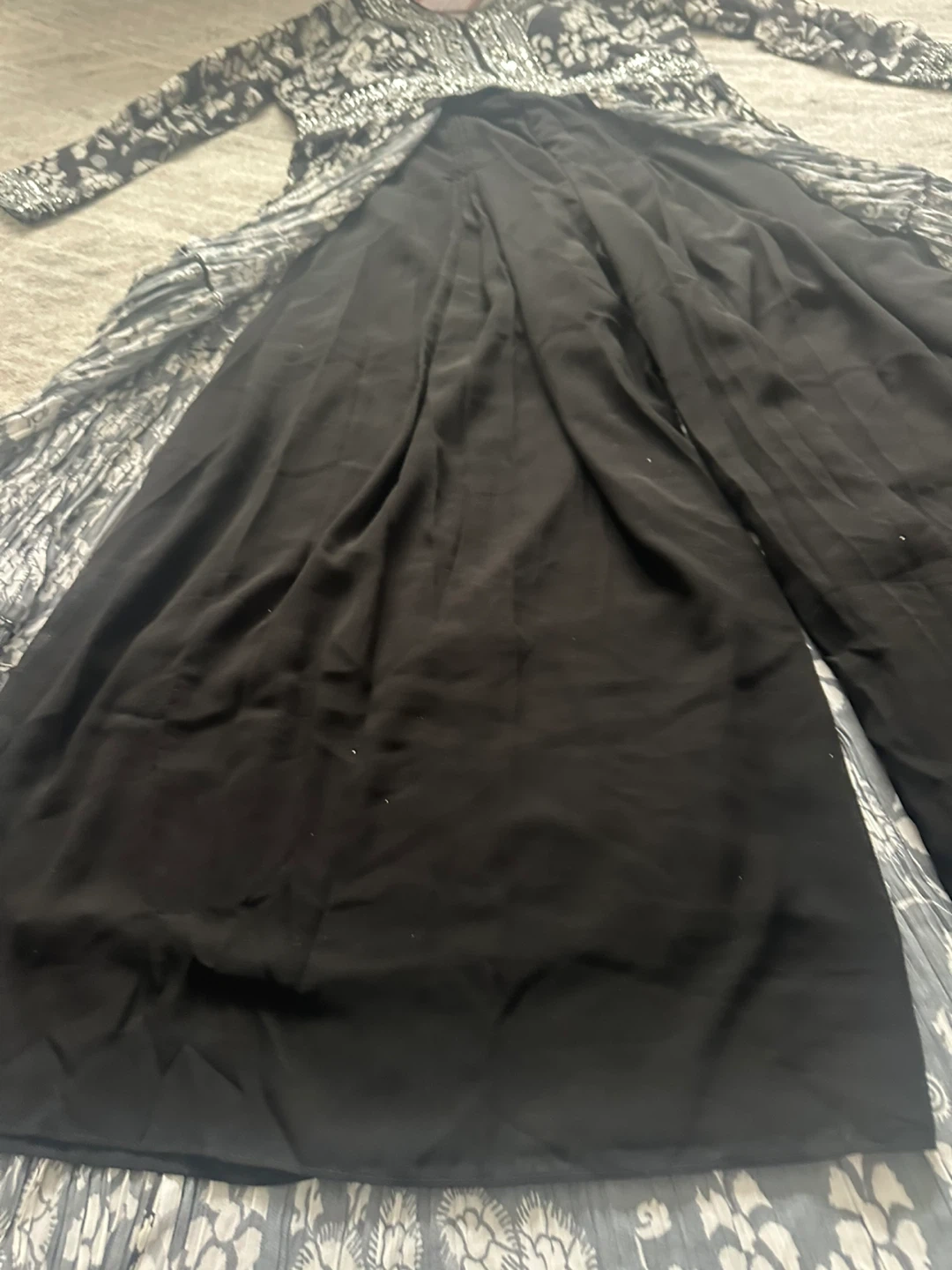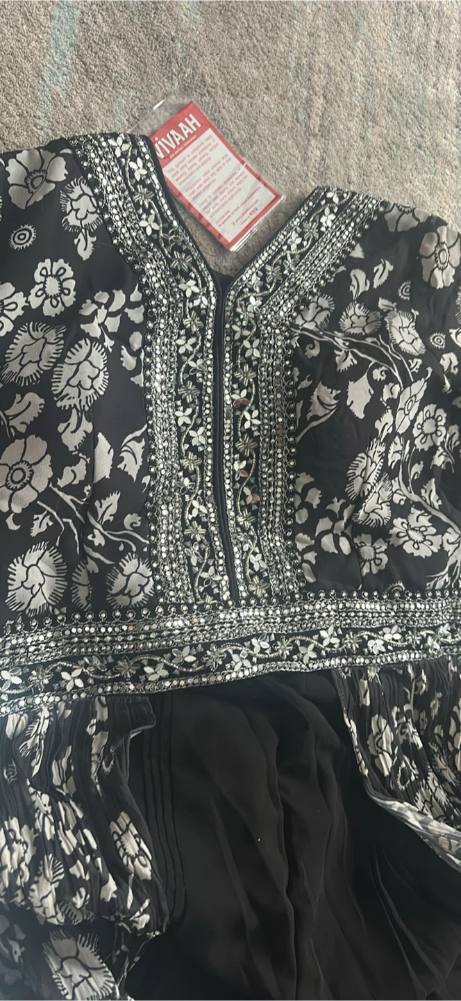 This VIVA-AH maxi dress features a black and white floral print. It has a V-neckline with intricate shisha and sequin embellishments. The dress has long sleeves and a flowing, tiered with plazo pants. This is a beautiful piece for special occasions! Never worn brand new with tag.