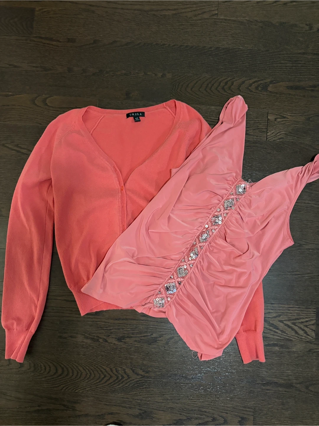 This is a UK2LA coral cardigan with a matching embellished tank top. The tank top has silver sequins and beads on the front. It's a lovely set for layering!