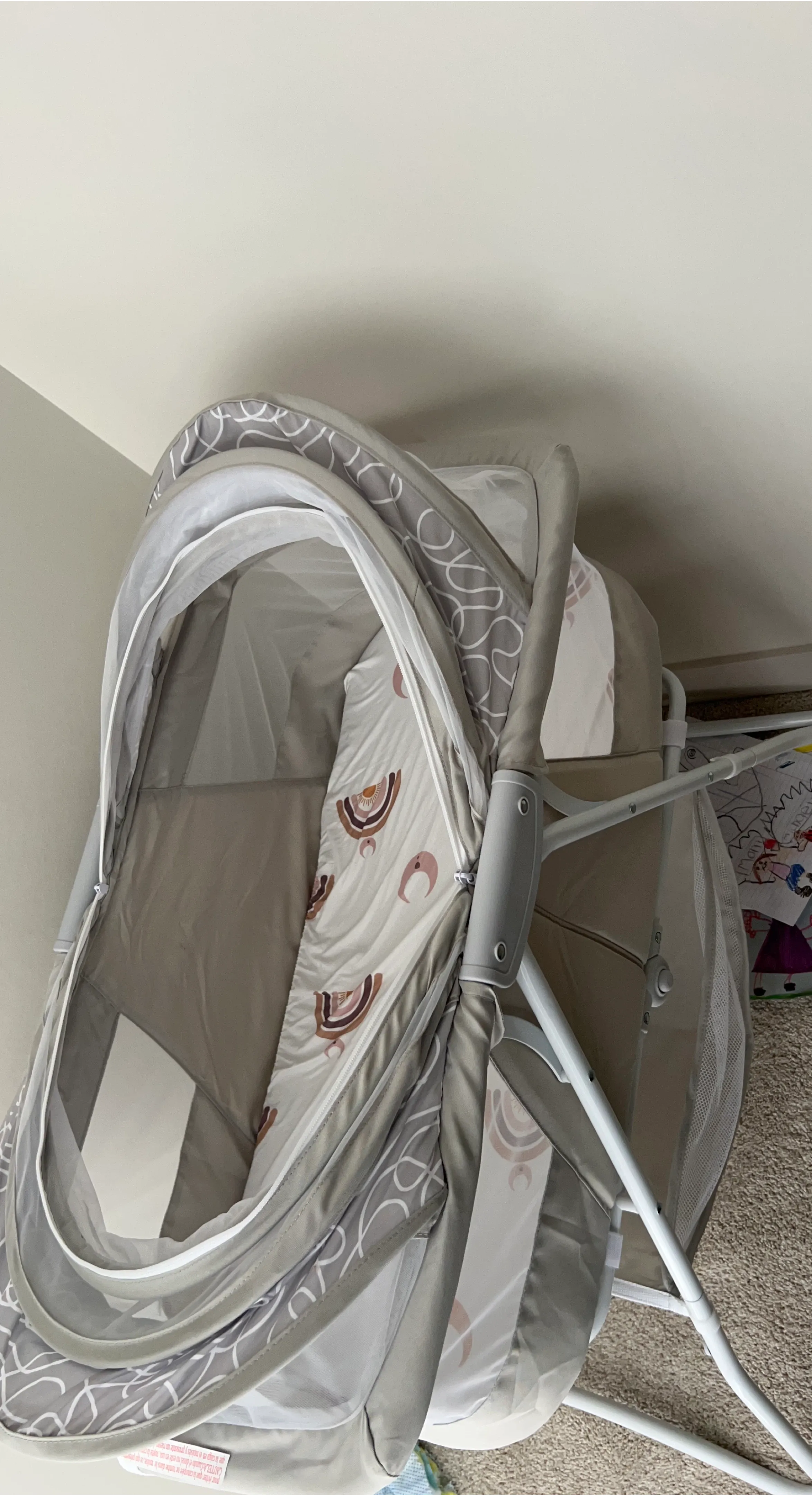 This is a greyish baby bassinet. It has mesh sides for ventilation. Suitable for 0-6 months babies.