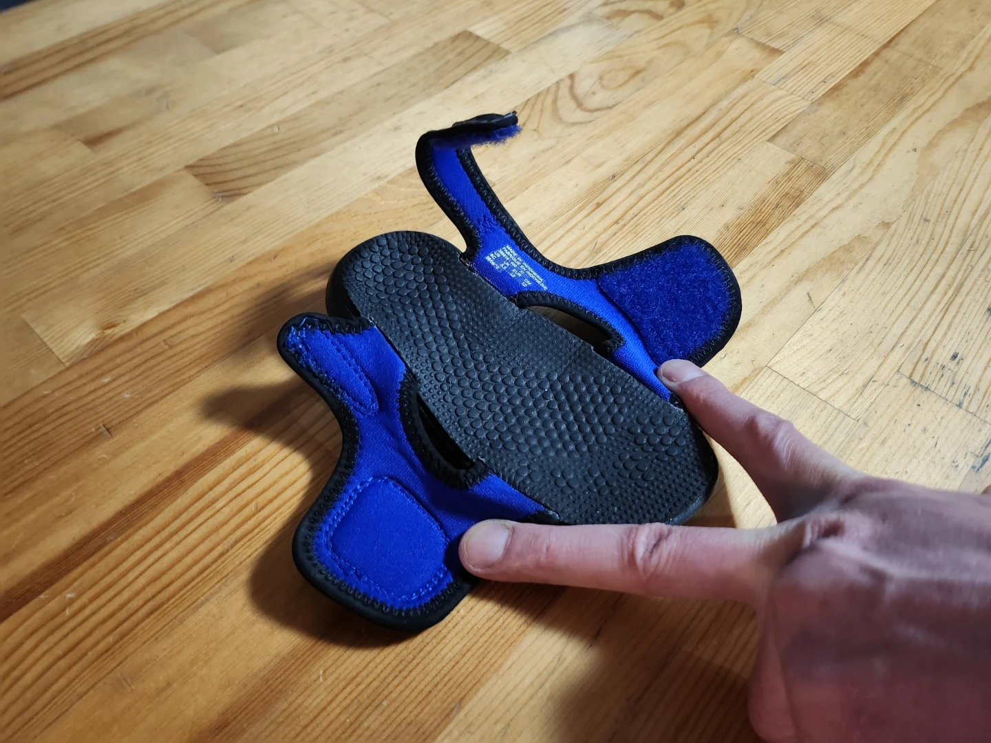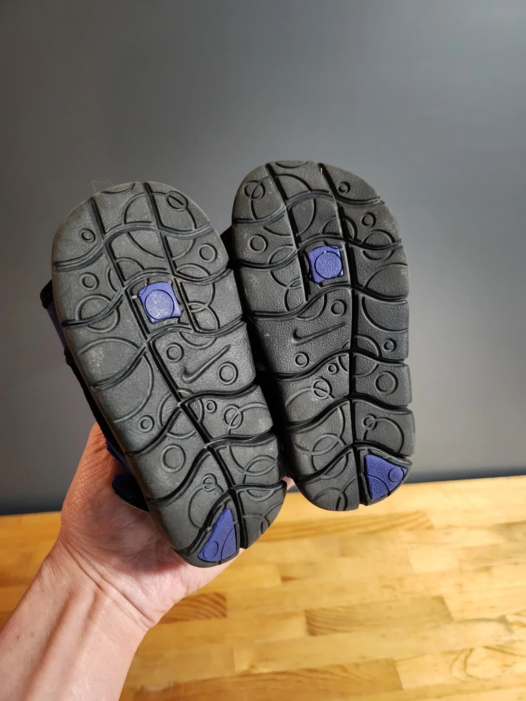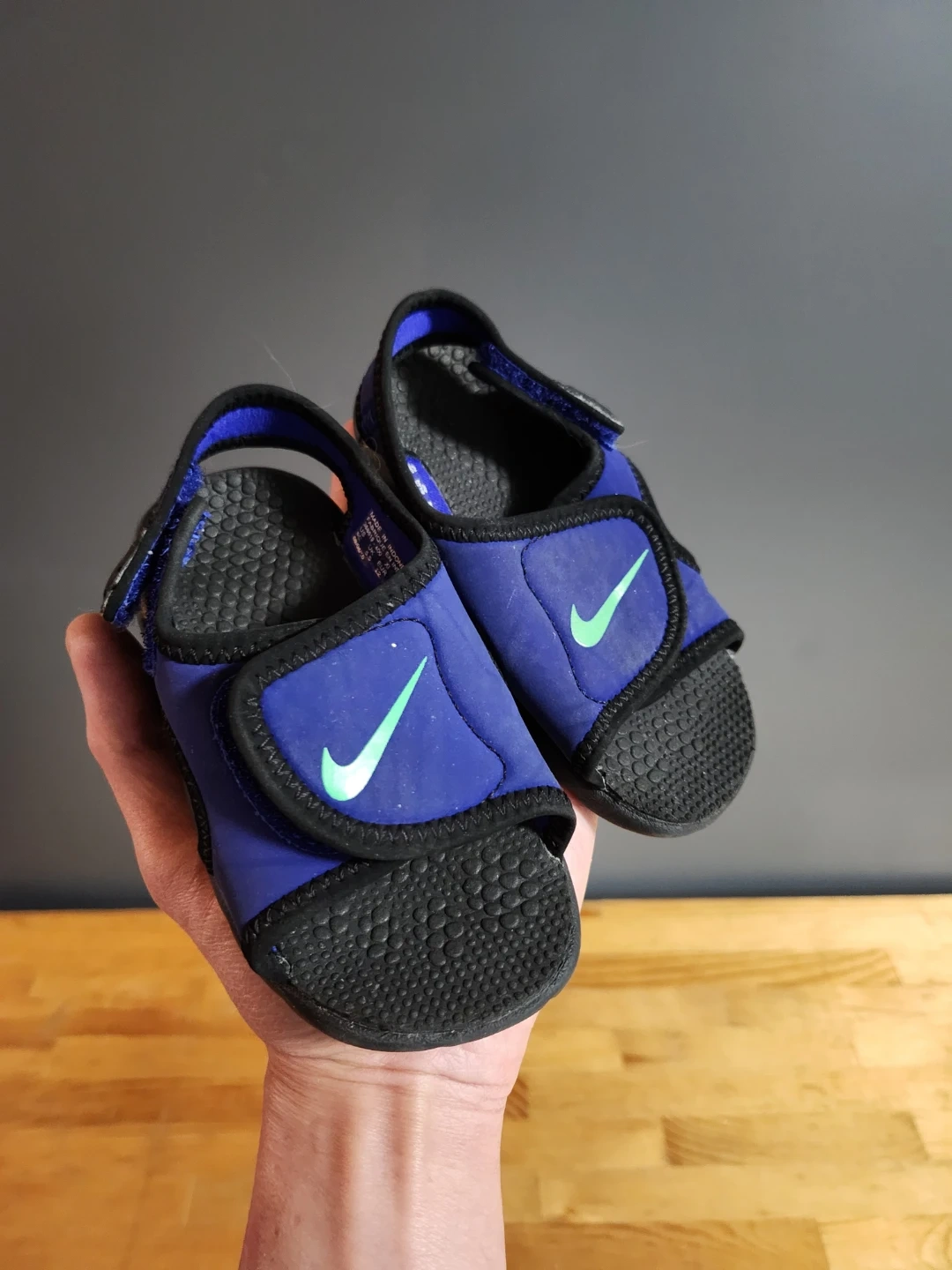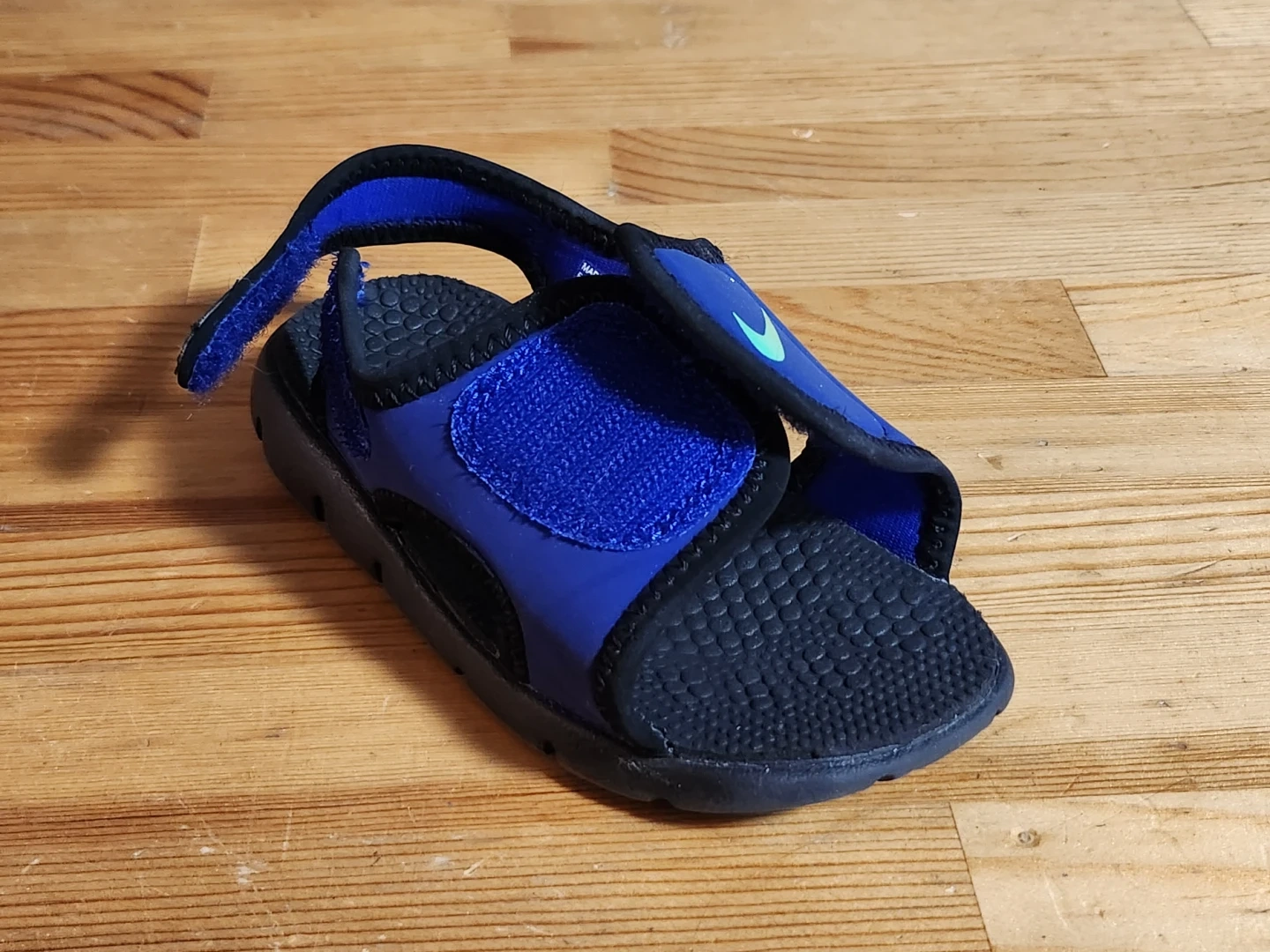 These toddler sandals are perfect for summer adventures! They are blue with a black sole and a velcro strap for easy on and off. The Nike swoosh is a nice touch.