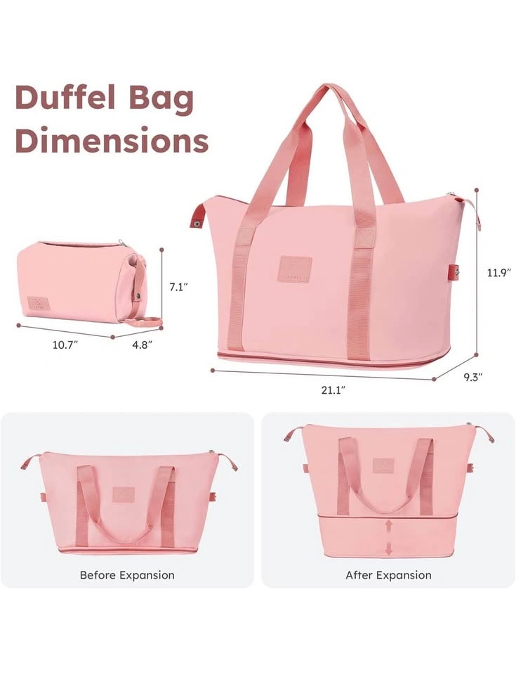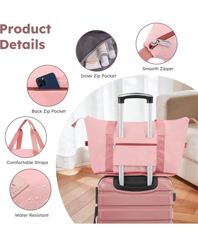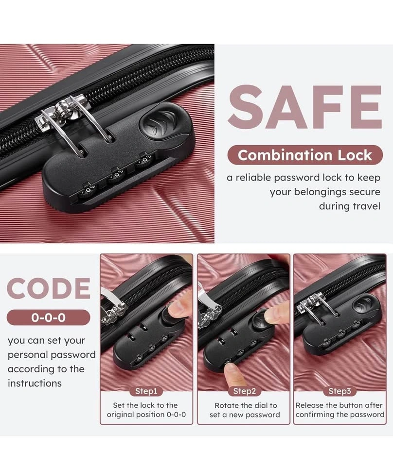 Brand new pink luggage set with 3 suitcases, toiletry bag, and duffel bag. The set has a textured finish, soft handle, side feet, and smooth zippers. The toiletry bag has an inner zip pocket and a back zip pocket. The duffel bag has comfortable straps and is water resistant. Available sizes are 20, 24, and 28 inches.