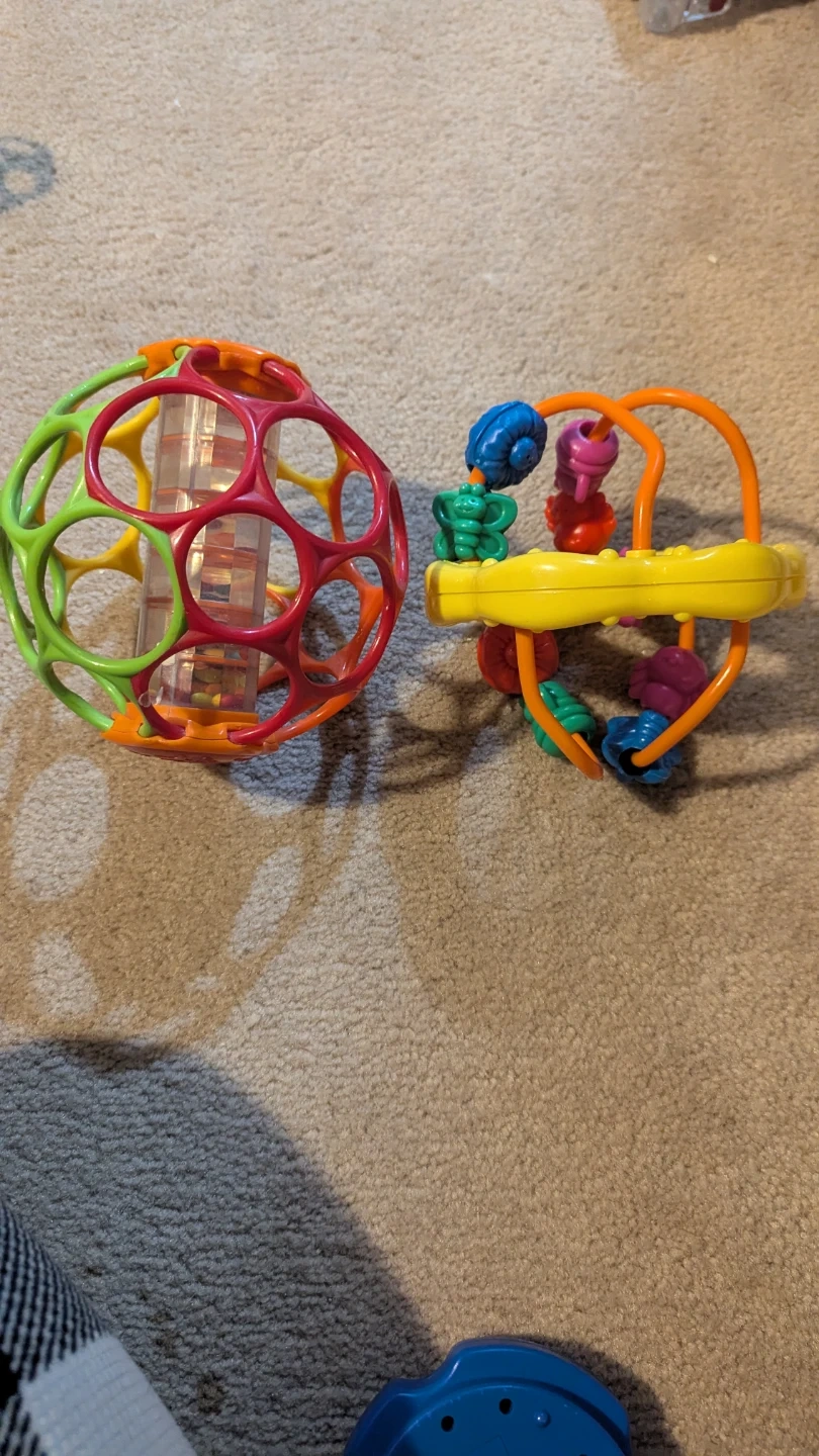 Two fun baby toys for sale! One is an Oball rattle with colourful beads inside, and the other is a roller toy with different textures and colours to explore. Great for sensory development and keeping little ones entertained