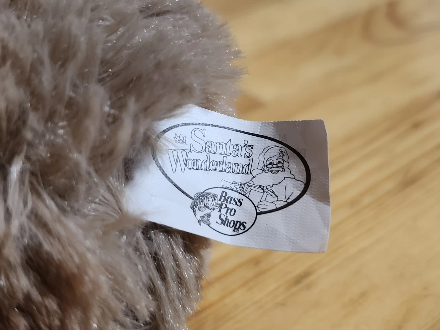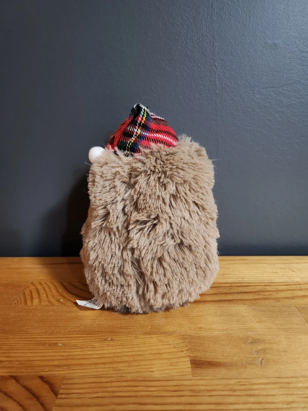The stuffed animal features a brown, soft fur coat and a red plaid night cap. The plush toy was part of a seasonal collection, making it a potentially retired item and a rare find for collectors.