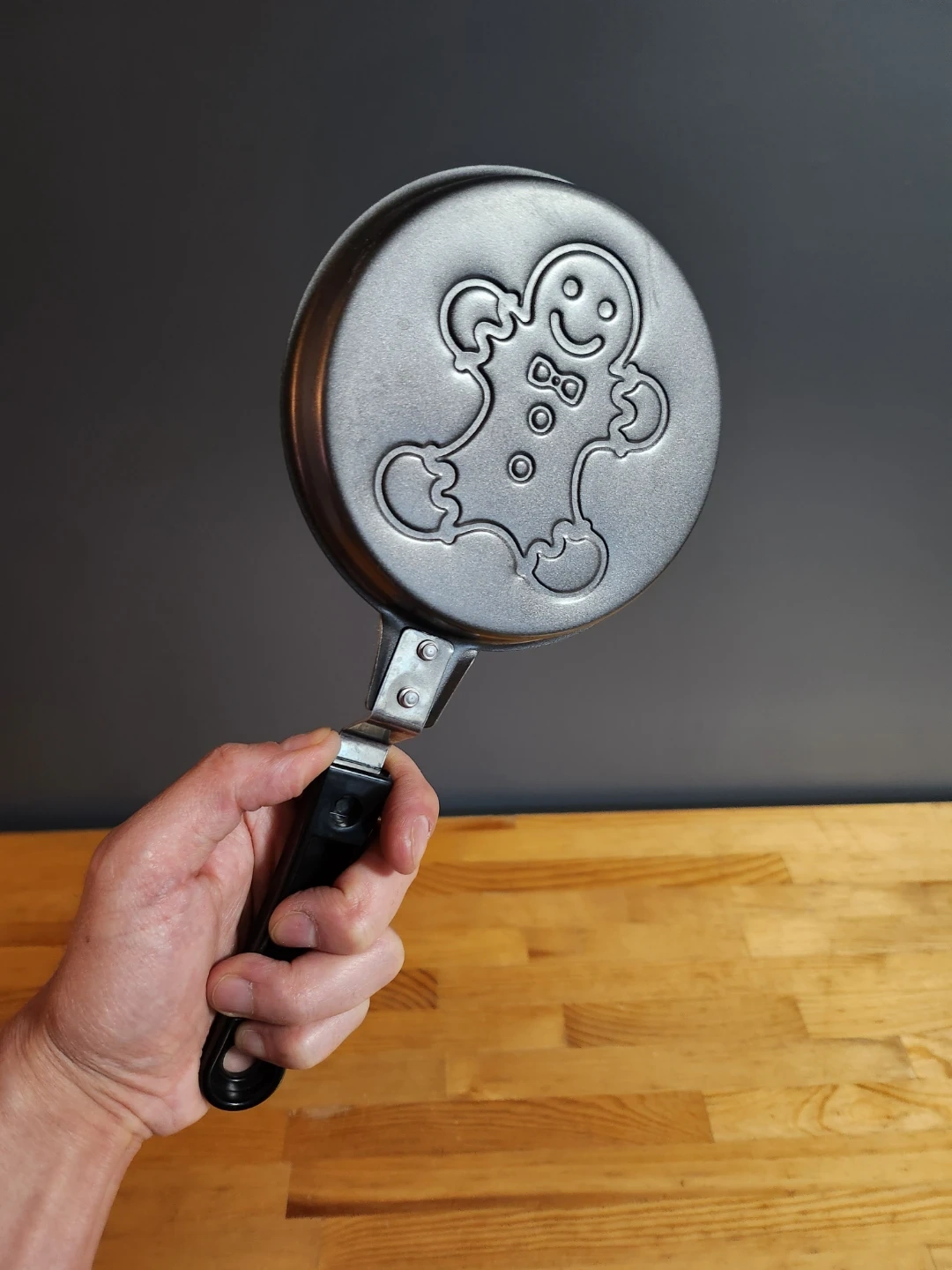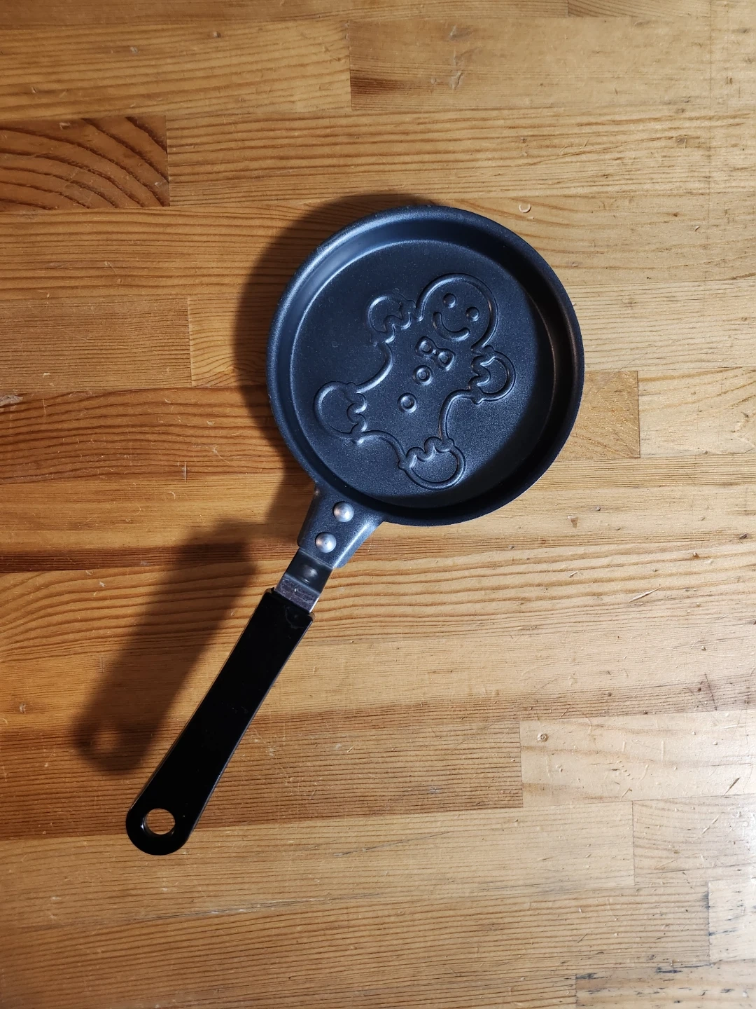 Non-stick pancake pan designed to cook a single pancake in the shape of a gingerbread man. Made from carbon steel with a non-stick coating. The pan features a low, flared rim for easy pancake removal.