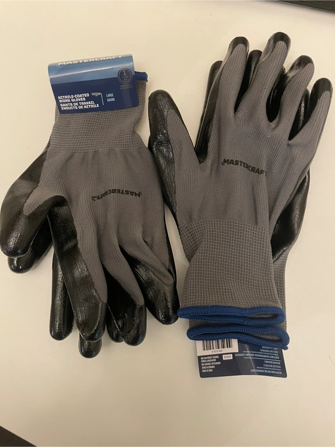 Selling a pair of Mastercraft nitrile-coated work gloves in size large. These gloves are designed for work and provide excellent dexterity. The micro foam coating improves grip and they are machine washable