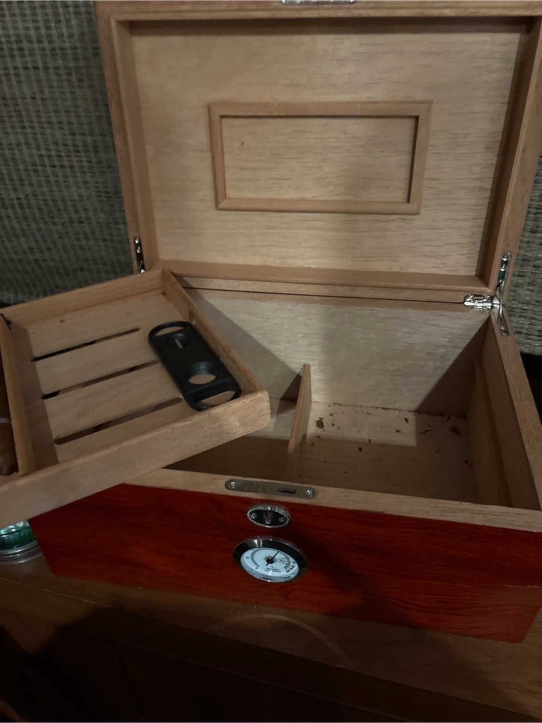 Selling a cigar humidor, perfect for keeping your cigars in great condition. It comes with a built-in hygrometer to monitor humidity levels, and also includes a cigar cutter. A great set for any cigar aficionado!