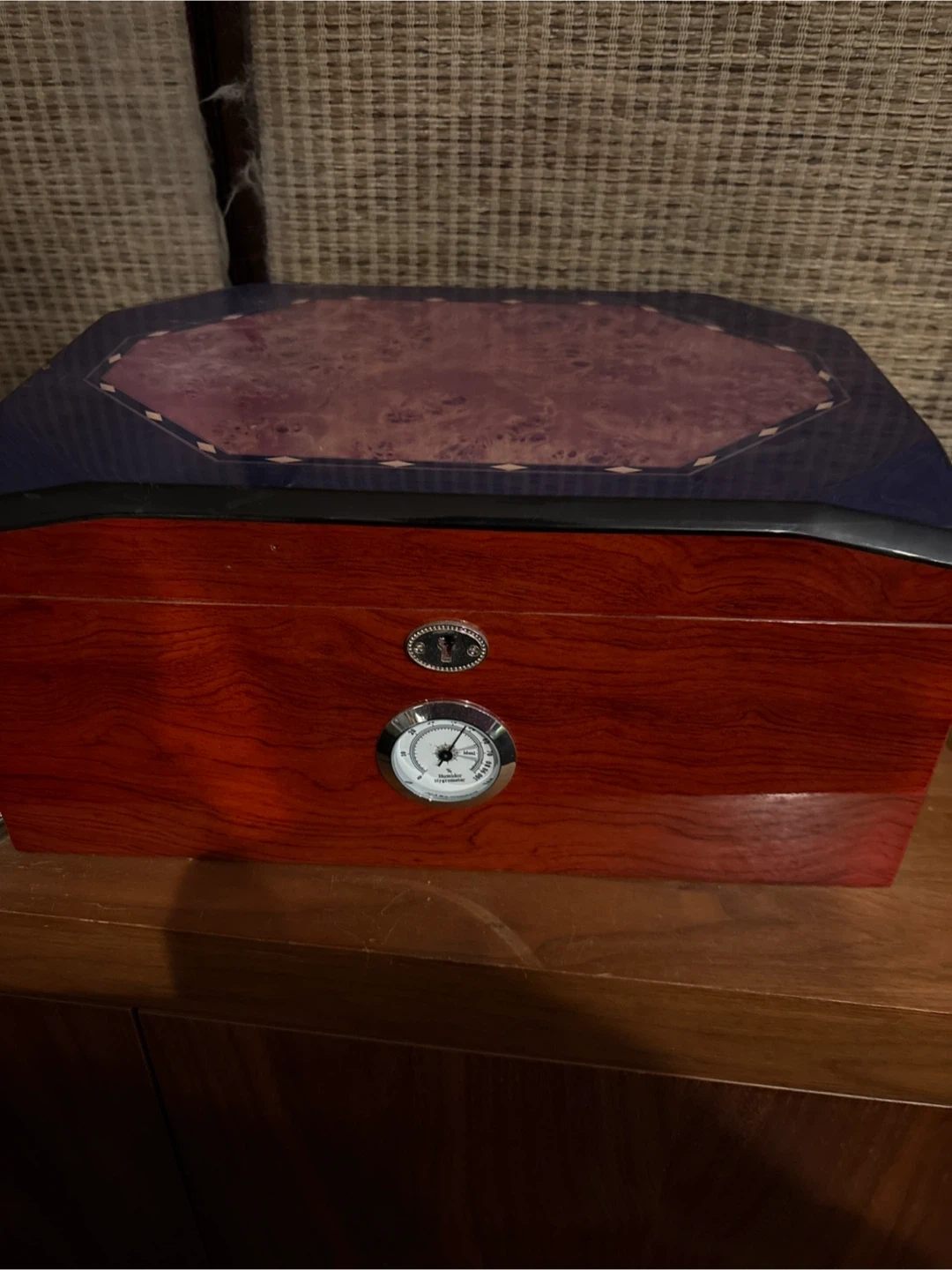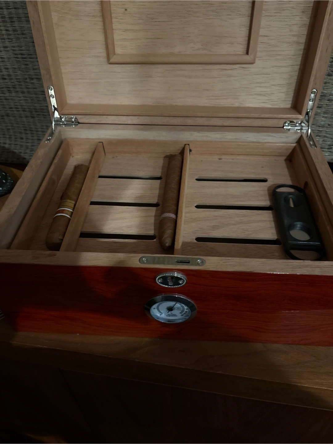 Selling a cigar humidor, perfect for keeping your cigars in great condition. It comes with a built-in hygrometer to monitor humidity levels, and also includes a cigar cutter. A great set for any cigar aficionado!