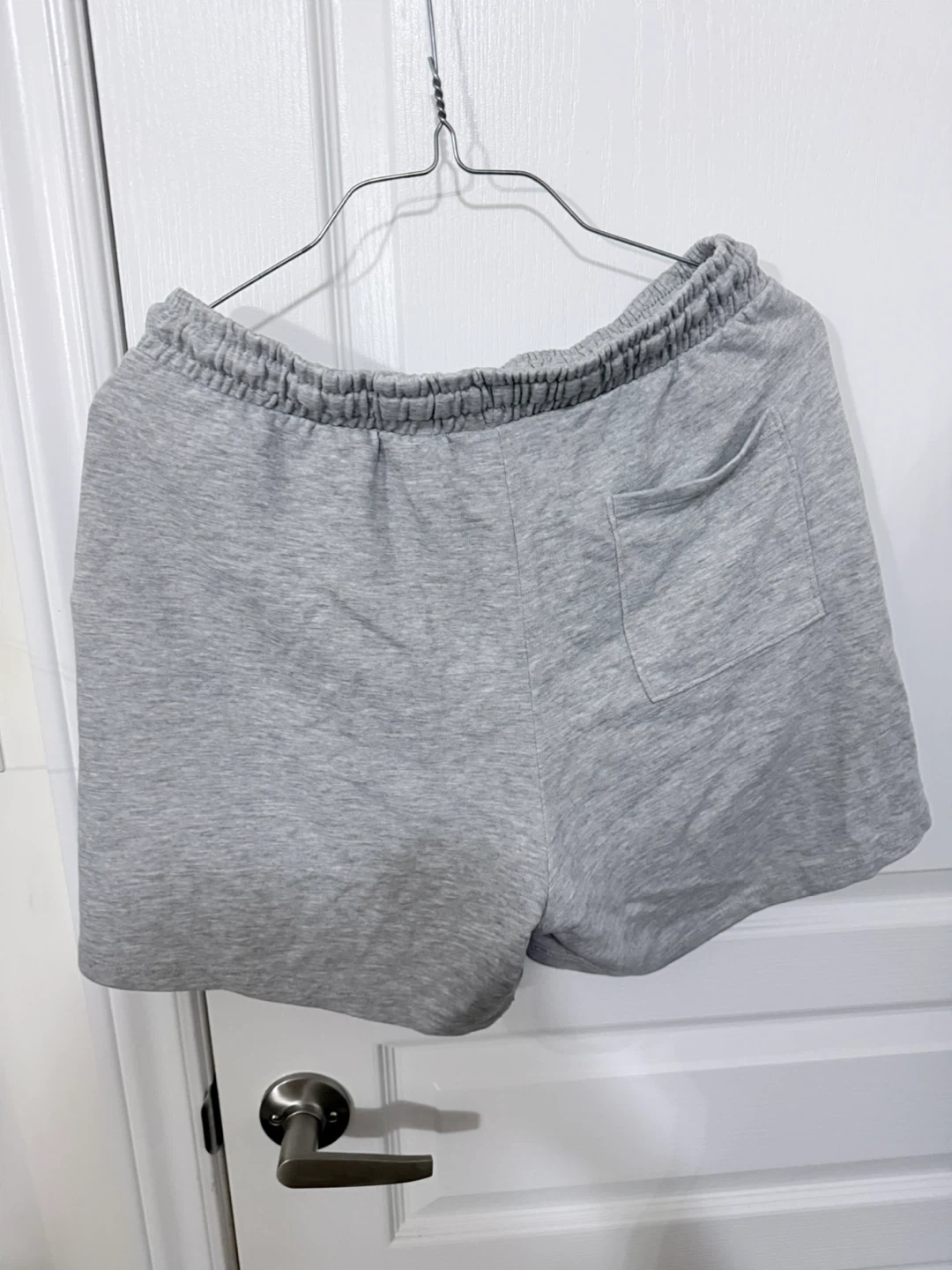 Selling a pair of grey sweat shorts. They're in great condition and super comfy for lounging around the house or running errands. The shorts have a drawstring waist and pockets