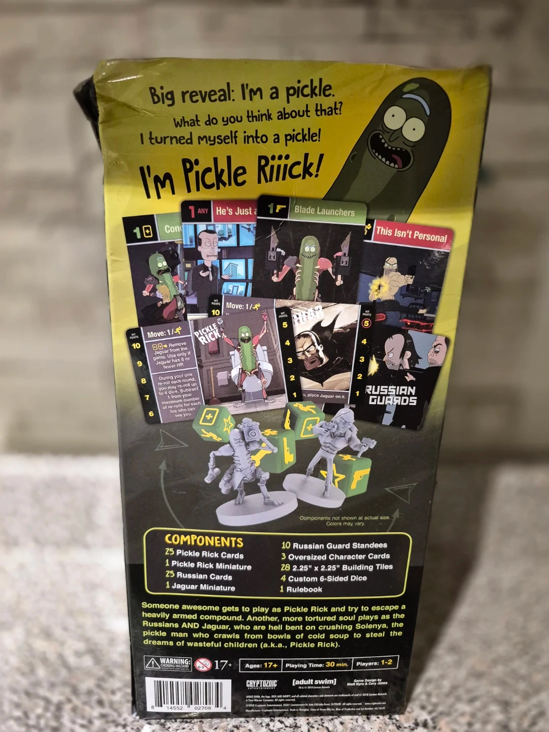 Selling a Rick and Morty Pickle Rick figure along with a Rick and Morty playing card game. The figure is in its original packaging. The playing cards feature exclusive "Royal" artwork of Rick, Morty and the gang! Includes 25 Pickle Rick cards, 25 Russian cards, and 1 Jaguar miniature..All new just damaged box. Cards are still have the factory wrap around the box