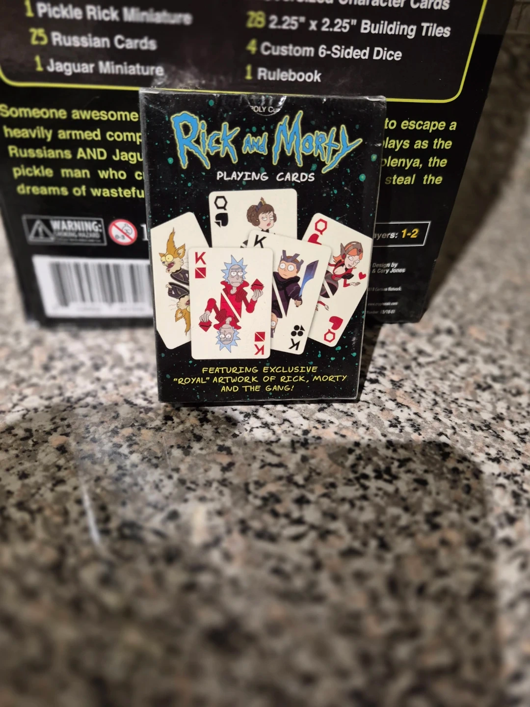 Selling a Rick and Morty Pickle Rick figure along with a Rick and Morty playing card game. The figure is in its original packaging. The playing cards feature exclusive "Royal" artwork of Rick, Morty and the gang! Includes 25 Pickle Rick cards, 25 Russian cards, and 1 Jaguar miniature..All new just damaged box. Cards are still have the factory wrap around the box