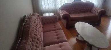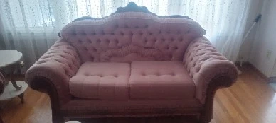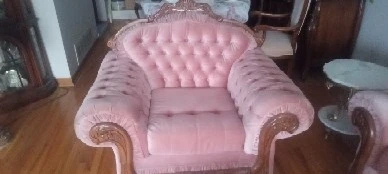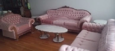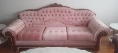 Selling a charming vintage sofa set in a lovely pink hue! This set includes a sofa, loveseat, and armchair, all featuring a classic tufted design. The elegant wooden trim adds a touch of sophistication. Perfect for adding a touch of vintage flair to your living room or den!