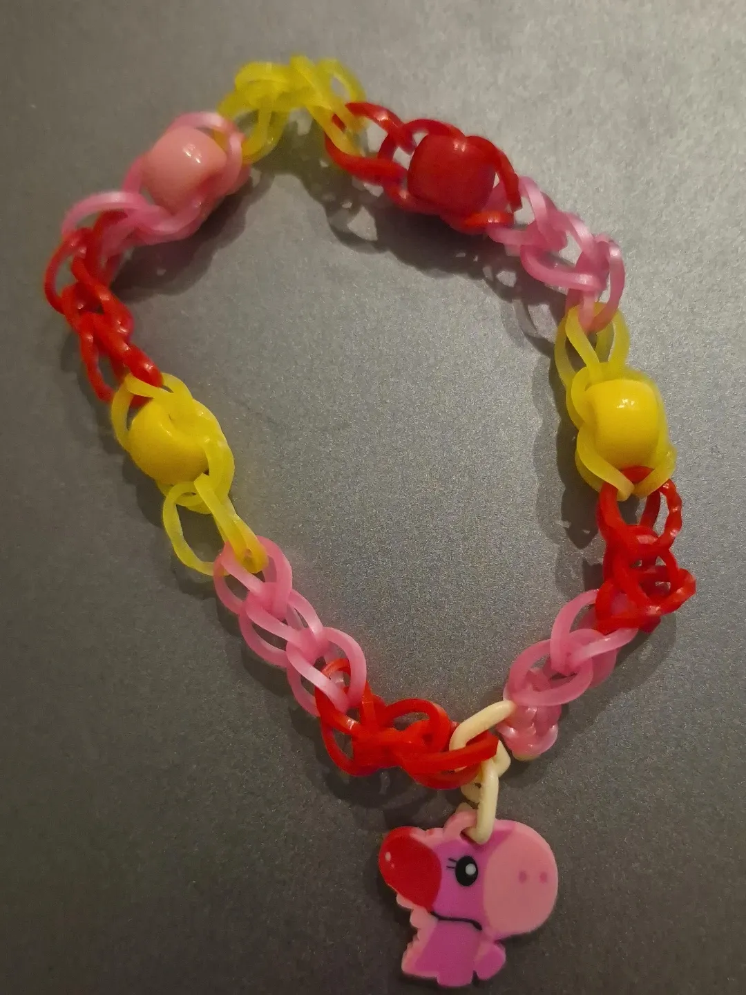 Check out this colourful handmade loom bracelet! It features a cute pink elephant charm and is made with red, yellow, and pink bands. Perfect for kids or anyone who loves fun accessories