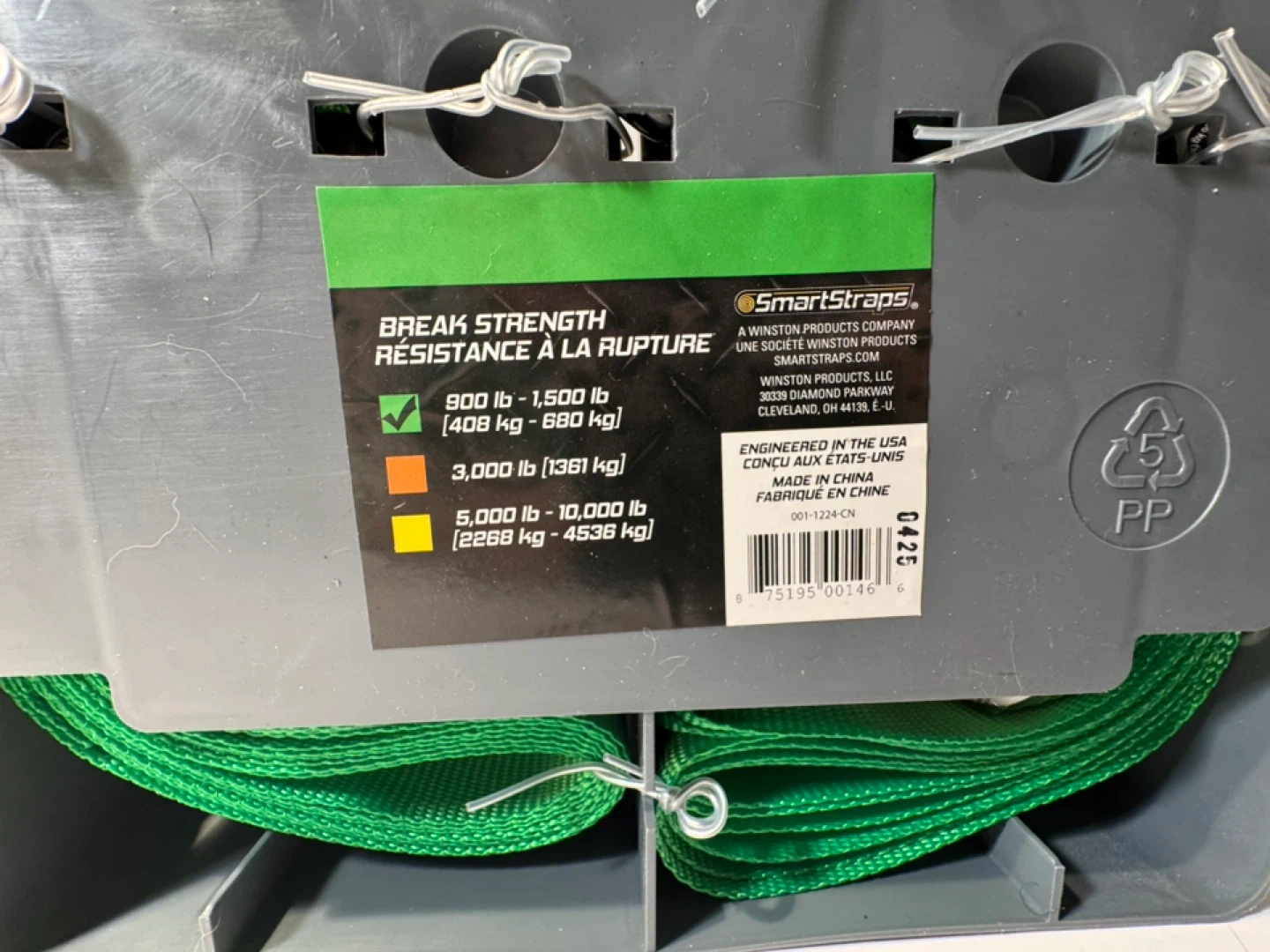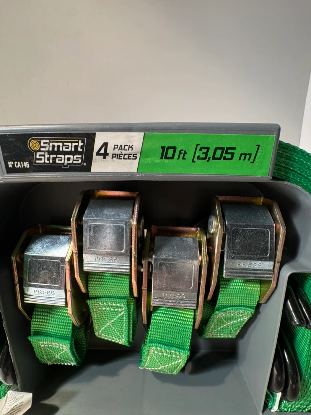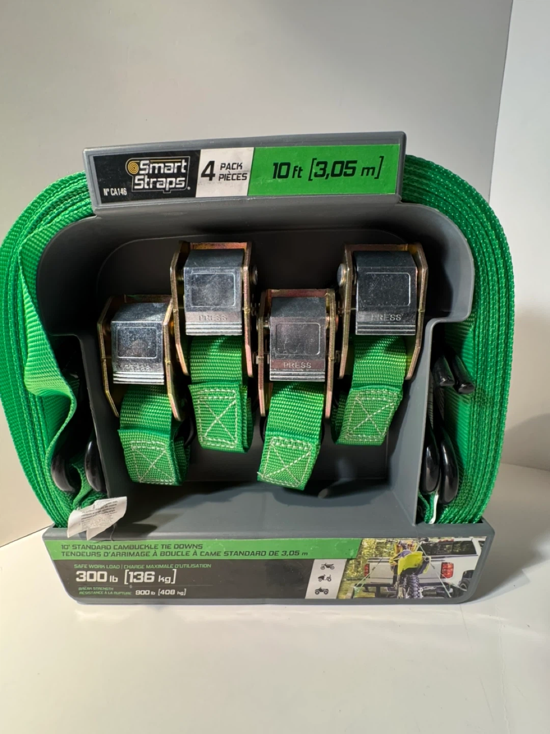 BRAND NEW pack of 4 SmartStraps cam buckle tie downs. They are 10 feet long each, or 3.05 meters. Each strap has a safe work load of 300 lbs (136 kg) and a break strength of 900 lbs (408 kg). Great for securing items!