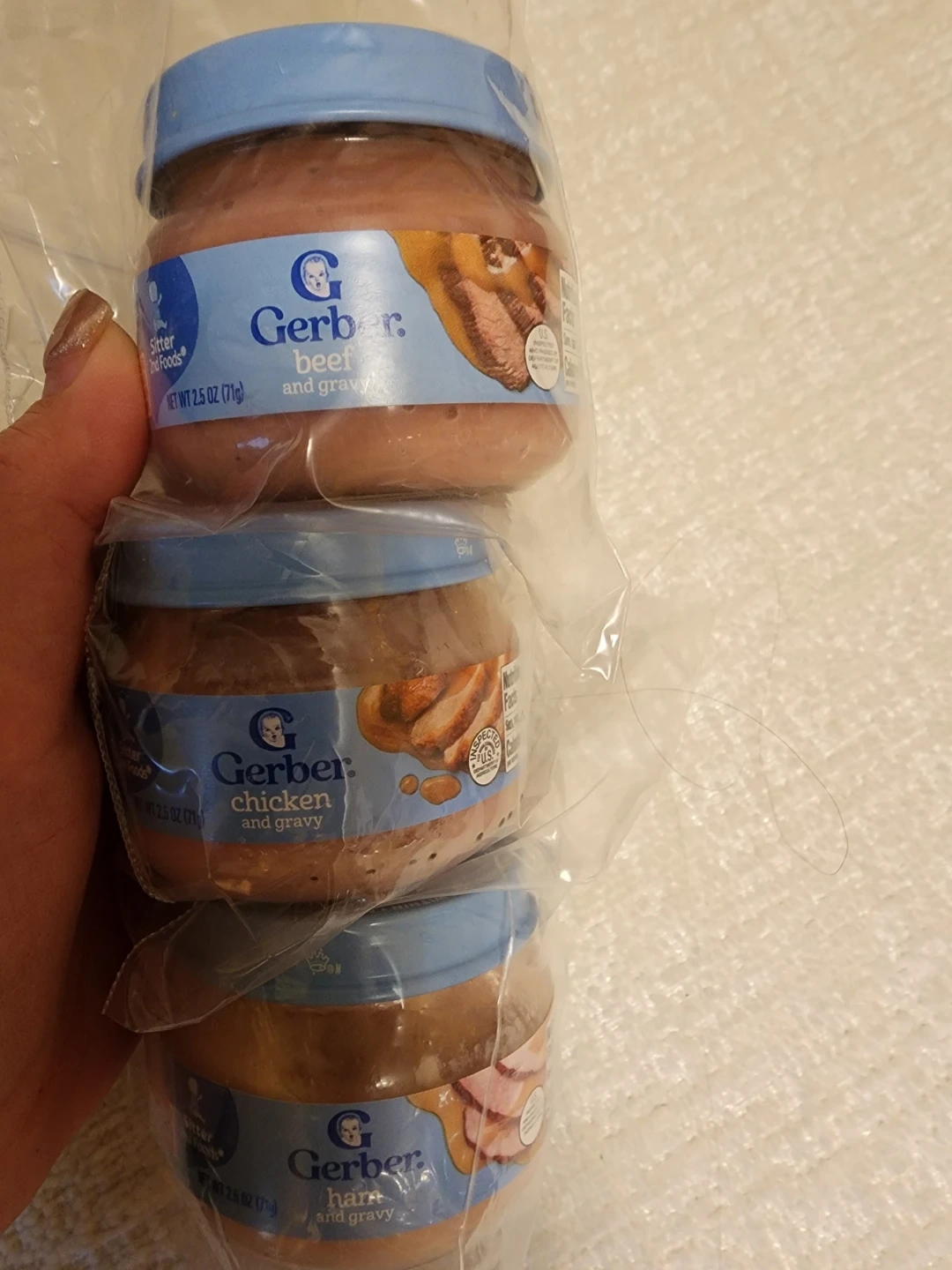 Gerber Seconds baby food. Includes beef and gravy, chicken and gravy, and ham and gravy flavours.