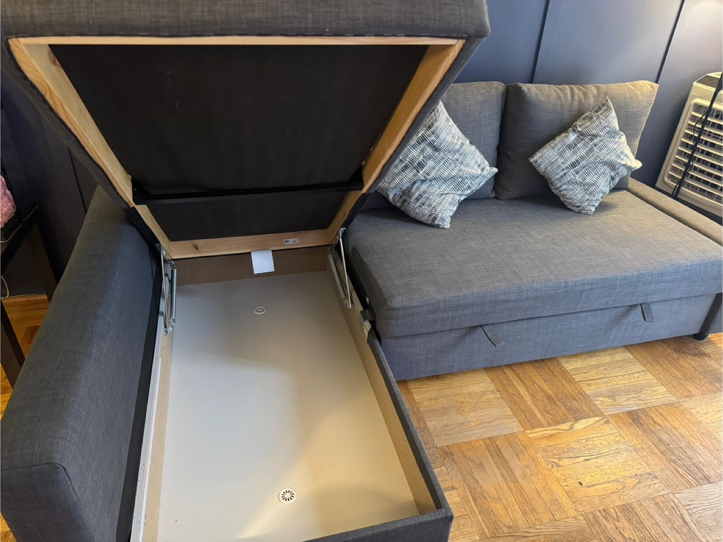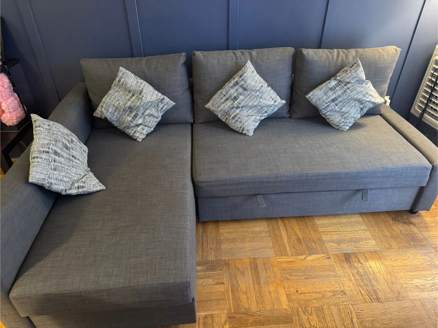Selling a modern grey L-shaped sofa bed in excellent condition. Very comfortable and clean, well maintained in a smoke-free home. Easily converts into a bed, perfect for guests or small apartments. Sturdy frame, firm cushions, and smooth pull-out mechanism.