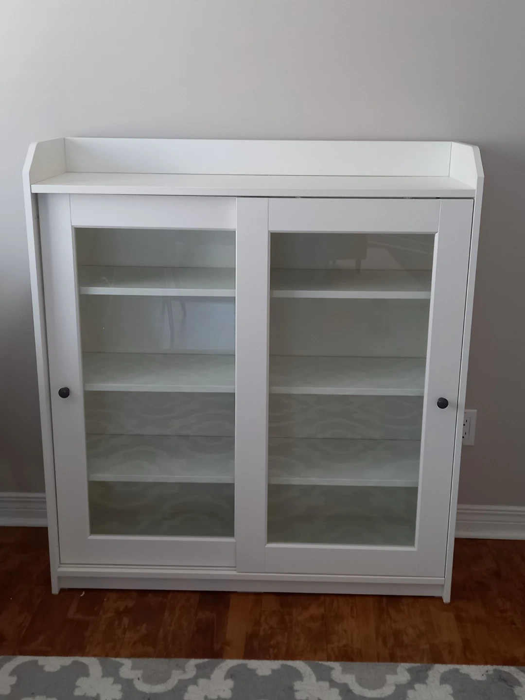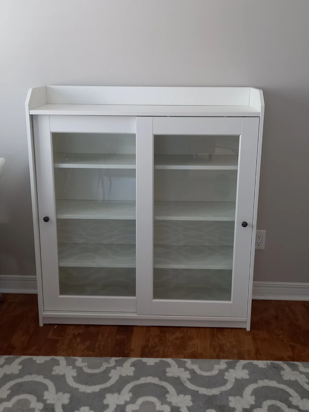 Selling a white IKEA Detolf cabinet in great condition! It's perfect for displaying collectibles or adding some extra storage space. The cabinet has glass doors, so you can easily see what's inside. It's a stylish and functional piece that would look great in any room