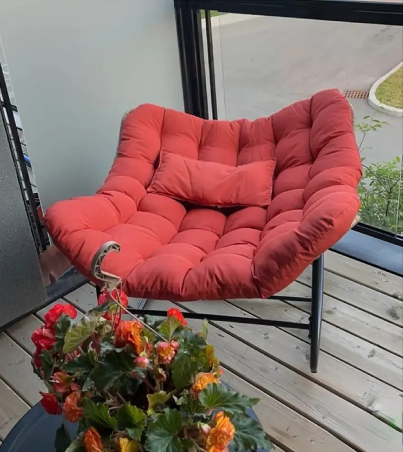 The bold flame-orange cushion is thick, plush, and incredibly inviting — perfect for relaxing on your patio, deck, or balcony.
