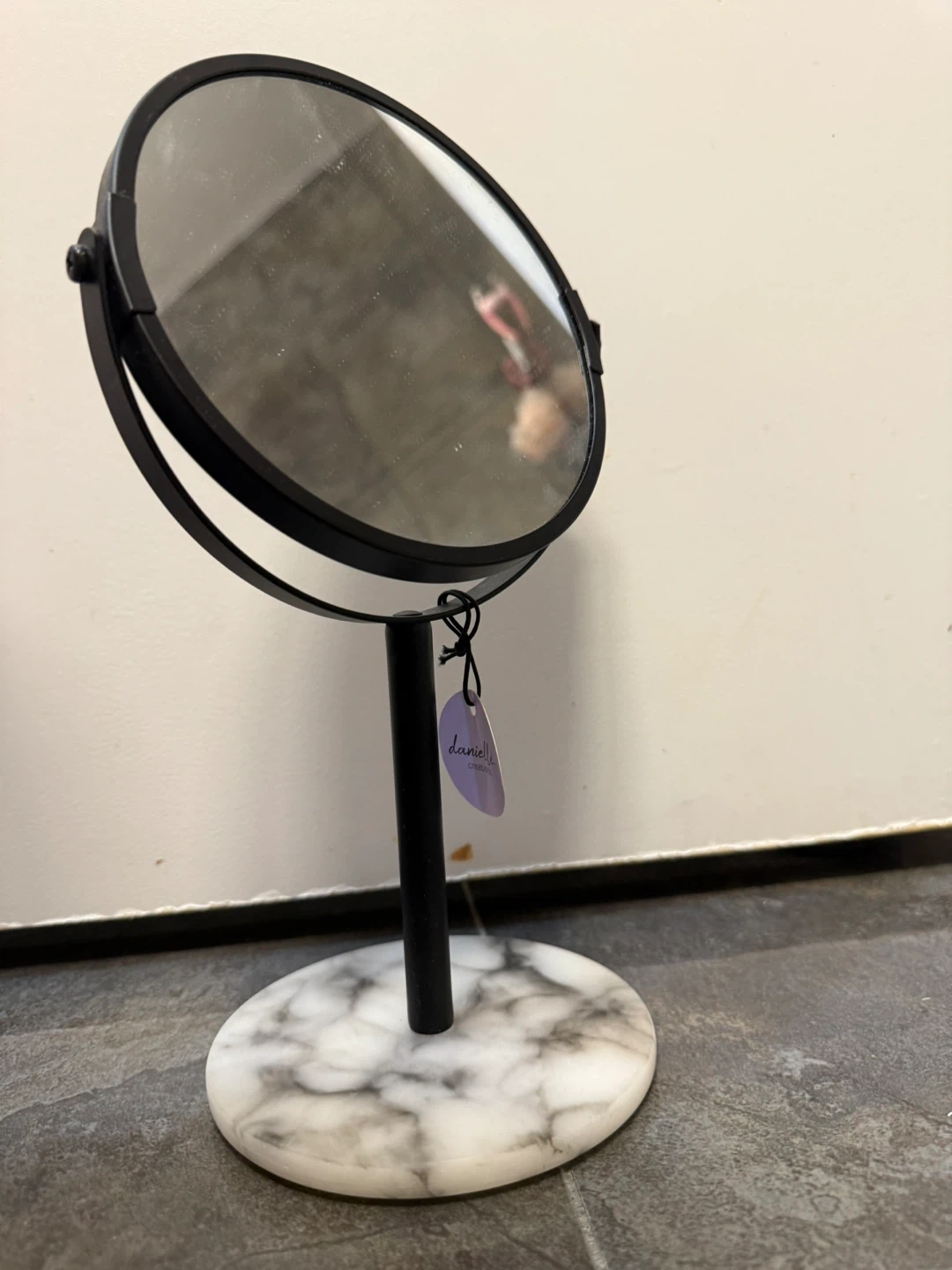 Selling a Danica vanity mirror with a stylish marble base. It's in great condition and would look lovely on any dresser or vanity! The mirror has a sleek black frame and a sturdy base.