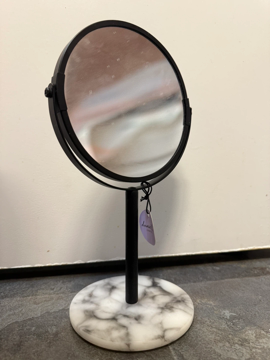 Selling a Danica vanity mirror with a stylish marble base. It's in great condition and would look lovely on any dresser or vanity! The mirror has a sleek black frame and a sturdy base.