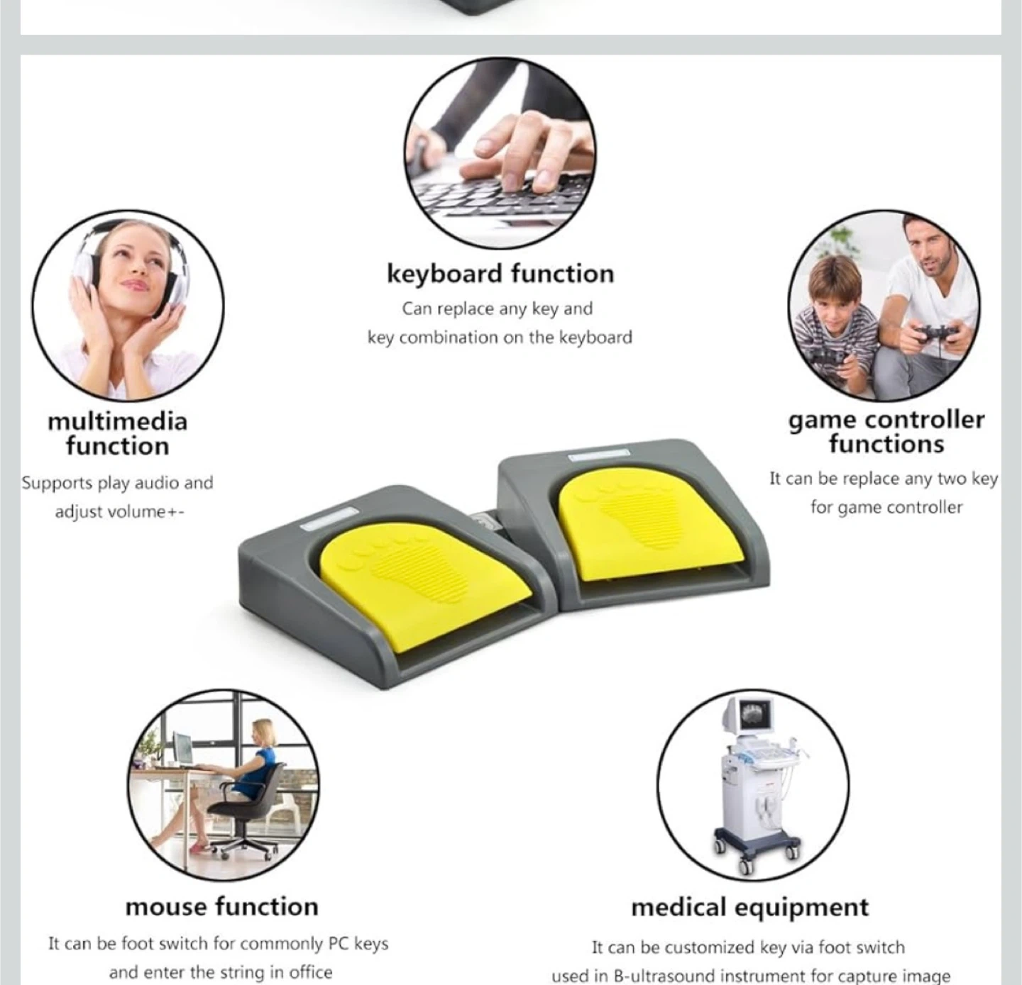 This Ikegol Double USB Foot Pedal Switch Control is versatile and reliable. It can replace any key and key combination on the keyboard. It supports play audio and adjust volume. It can also be customized key via foot switch used in B-Ultrasound instrument for capture image.