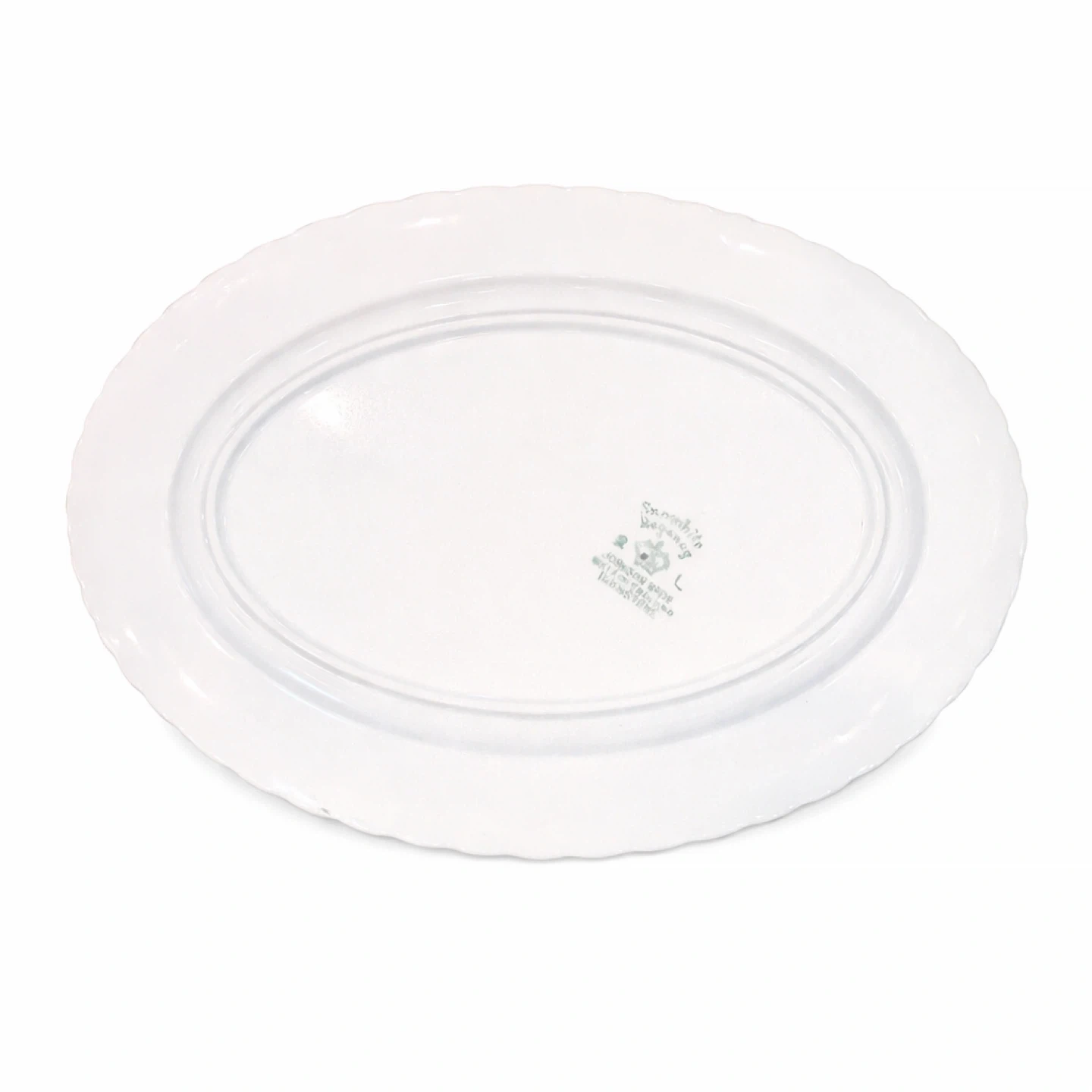 An exceptionally clean Johnson Bros “Snowhite Regency” oval Ironstone serving platter, Made in England, presented in collector-grade condition with crisp monochrome border work and a refined scalloped rim. The piece reads as a classic mid-century English tableware form—quietly luxurious, highly usable, and increasingly difficult to source in this level of preservation.
