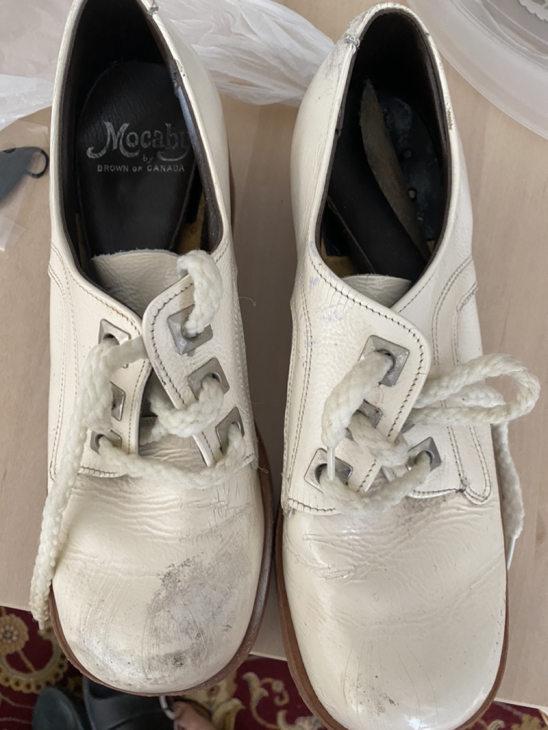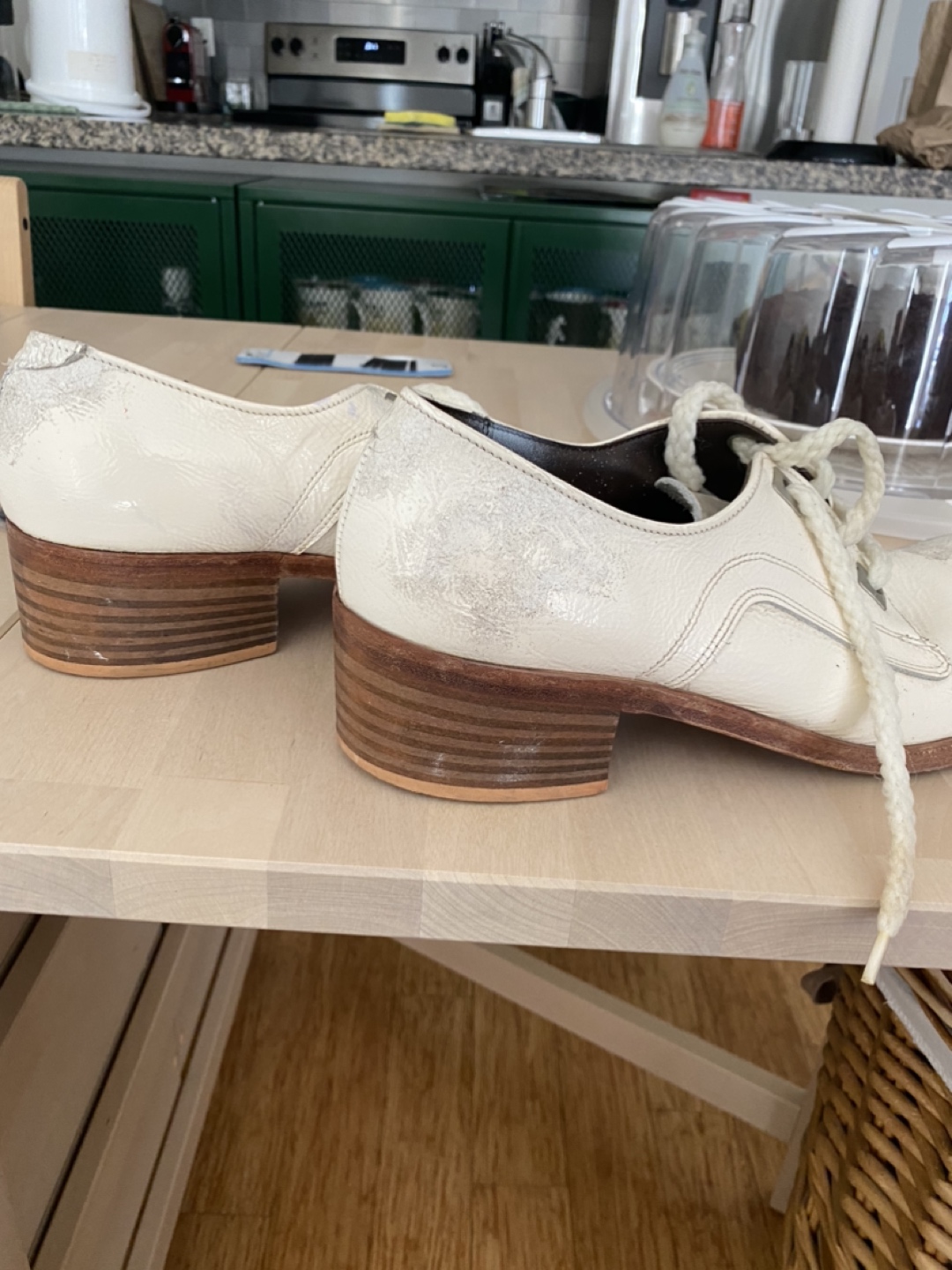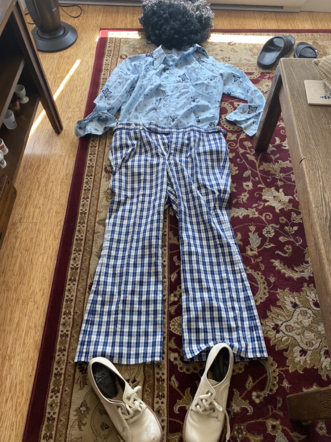Vintage 70s disco retro fashion for men! Long sleeve shirt with butterfly collar size L polyester, 36” waist 39.5” length bell bottom polyester pants, size 10 white Mocaby by Brown of Canada platform leather shoes, black Afro costume wig.