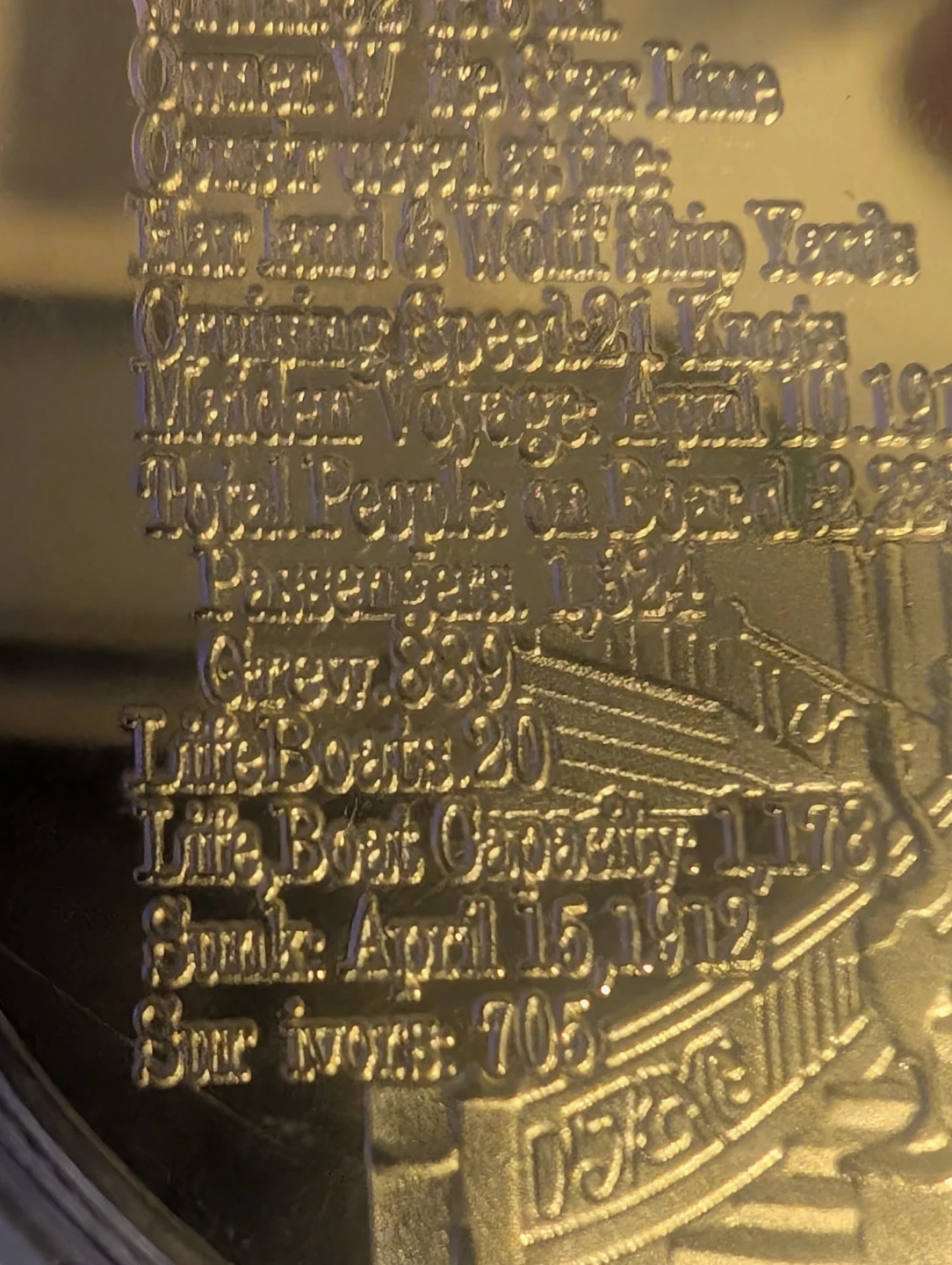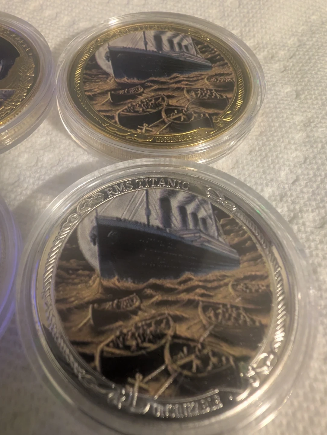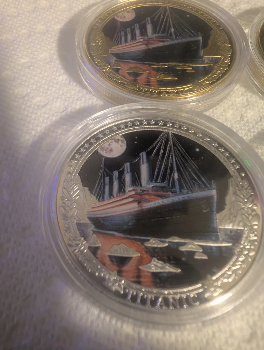 Selling a set of commemorative coins featuring the RMS Titanic. The coins are in protective cases. One coin is gold-toned and the other is silver-toned. The coins have details such as the ship's length (882 ft 9 in) and width (92 ft 6 in) etched on them