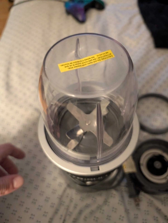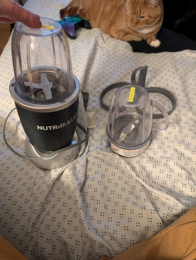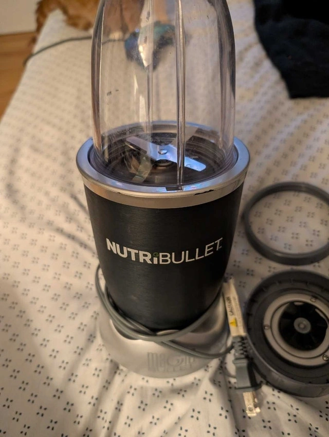 I'm selling a NutriBullet blender, perfect for making smoothies and shakes. This blender has been used but is still in good working condition. It’s ready to whip up your favourite drinks and comes with the accessories pictured. If the ad is up, it's available.