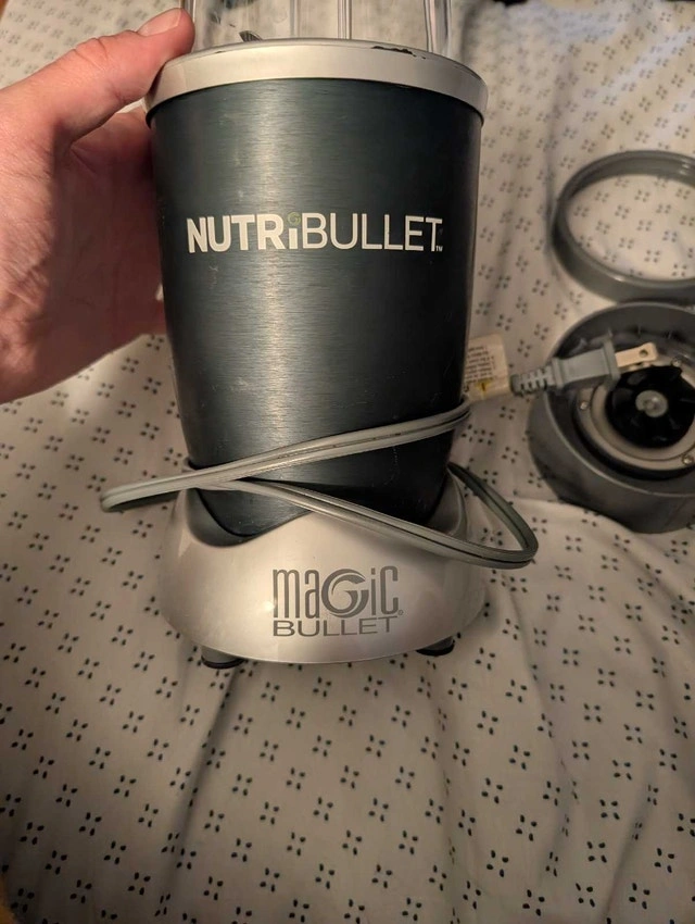 I'm selling a NutriBullet blender, perfect for making smoothies and shakes. This blender has been used but is still in good working condition. It’s ready to whip up your favourite drinks and comes with the accessories pictured. If the ad is up, it's available.