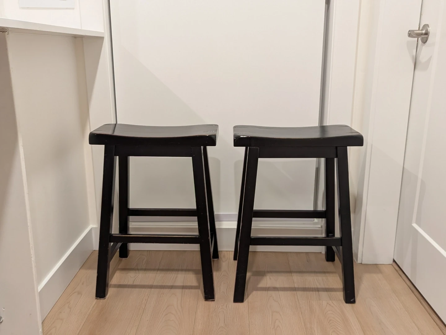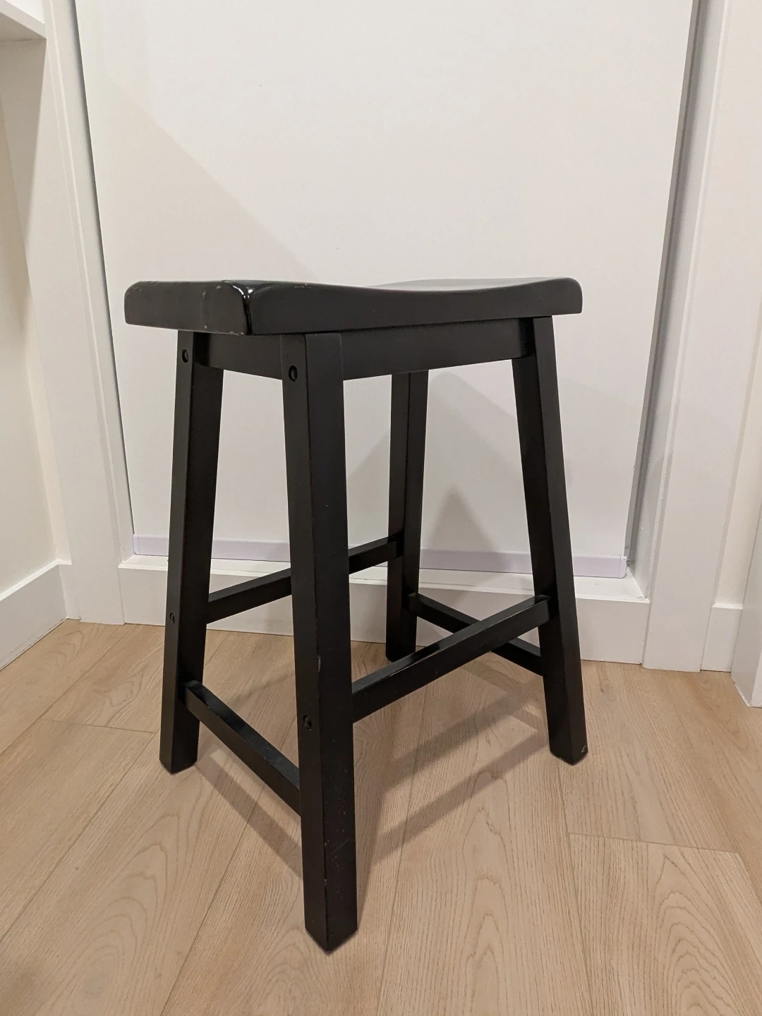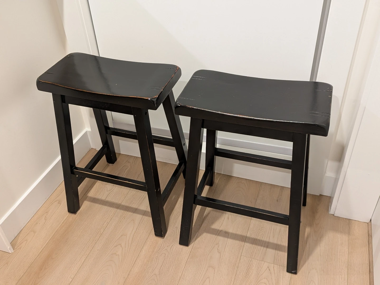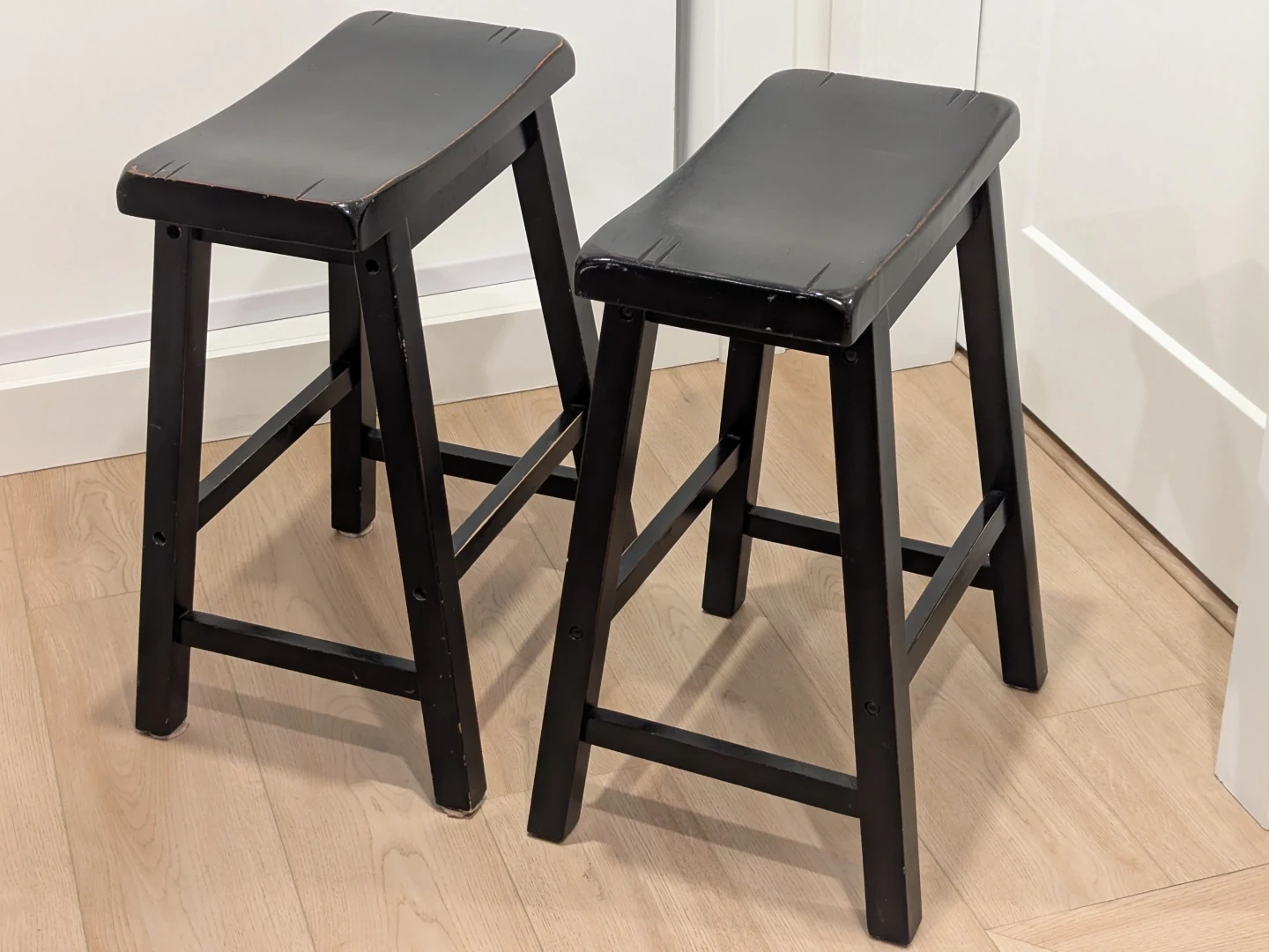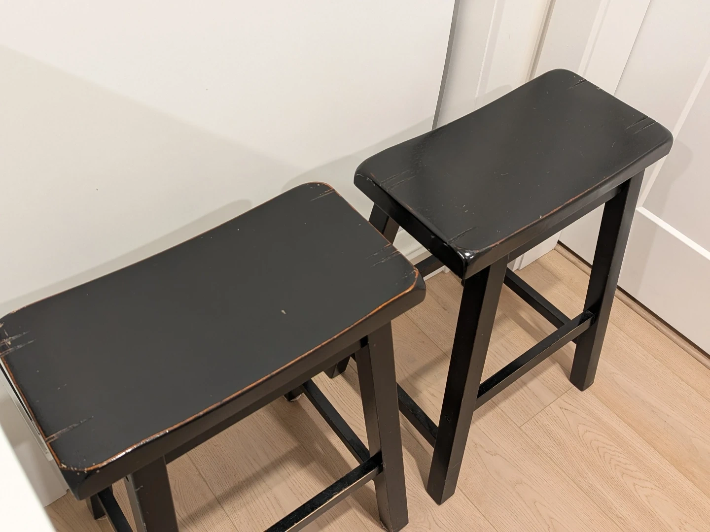 Selling a pair of black wooden bar stools. They've got a classic look and are sturdy enough for everyday use. There are some signs of wear and tear, but they're still in good condition and ready for a new home!
