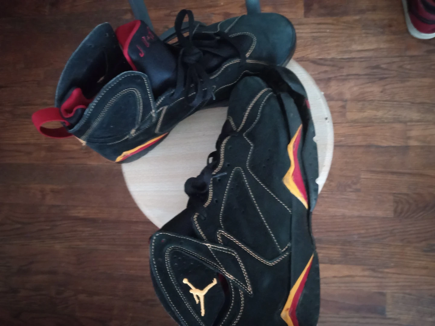 Selling a pair of Air Jordan 7 Citrus Retro sneakers.Needs to be taken to shoe repair to be reglued. They are black with red and gold accents. Overall, they are in great condition.