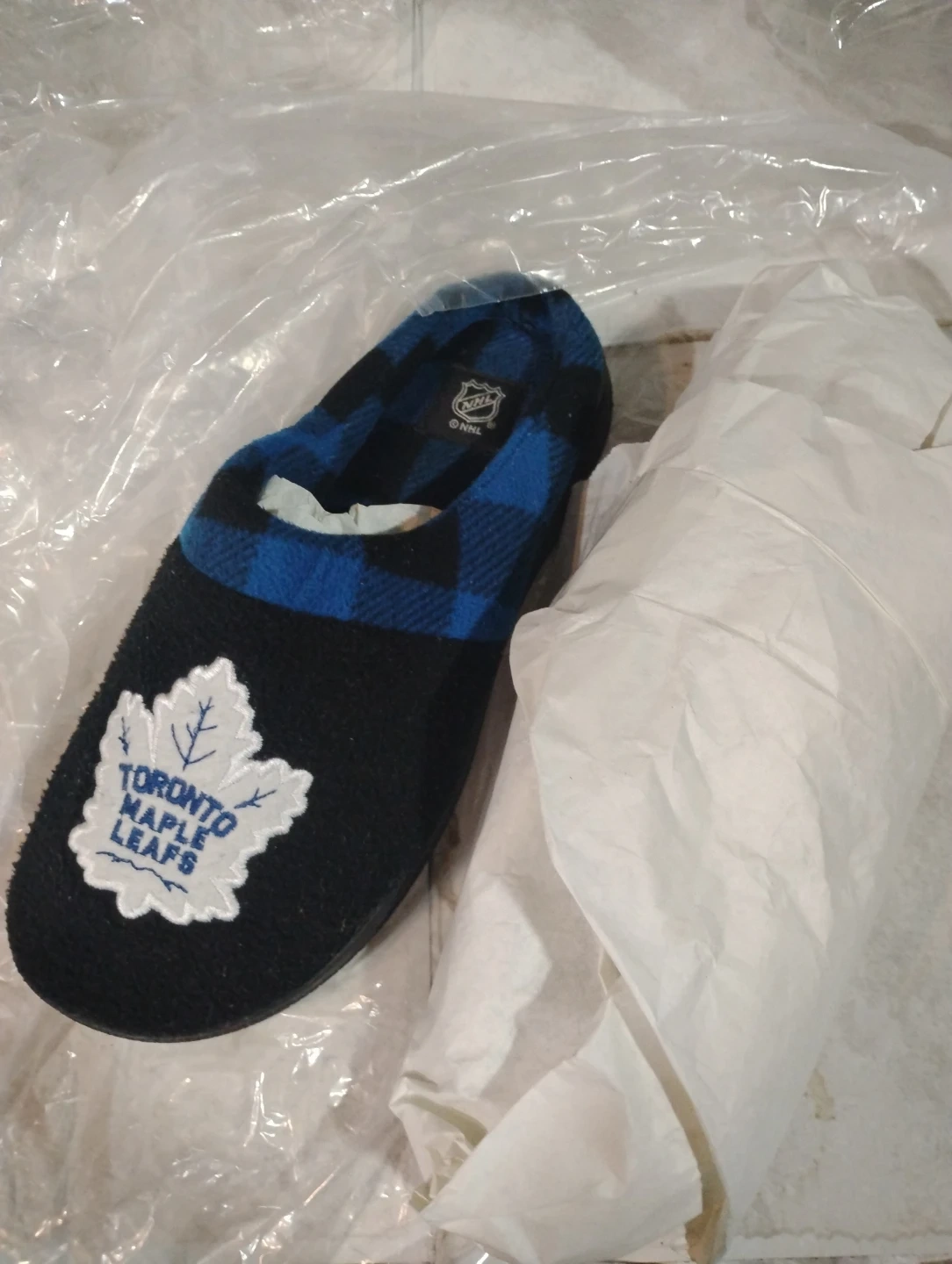 Cozy Toronto Maple Leafs slippers in size 7-8! They feature the classic Leafs logo and are perfect for keeping your feet warm while showing your team spirit
