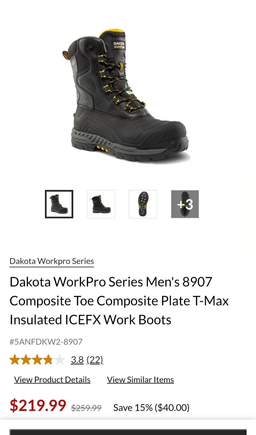 Selling a pair of Dakota WorkPro Series Men's 8907 Composite Toe Composite Plate T-Max Insulated ICEFX Work Boots. They are black and in great shape! Never been used just have been sitting around for a long time collecting dust lol Originally bought for $219.99